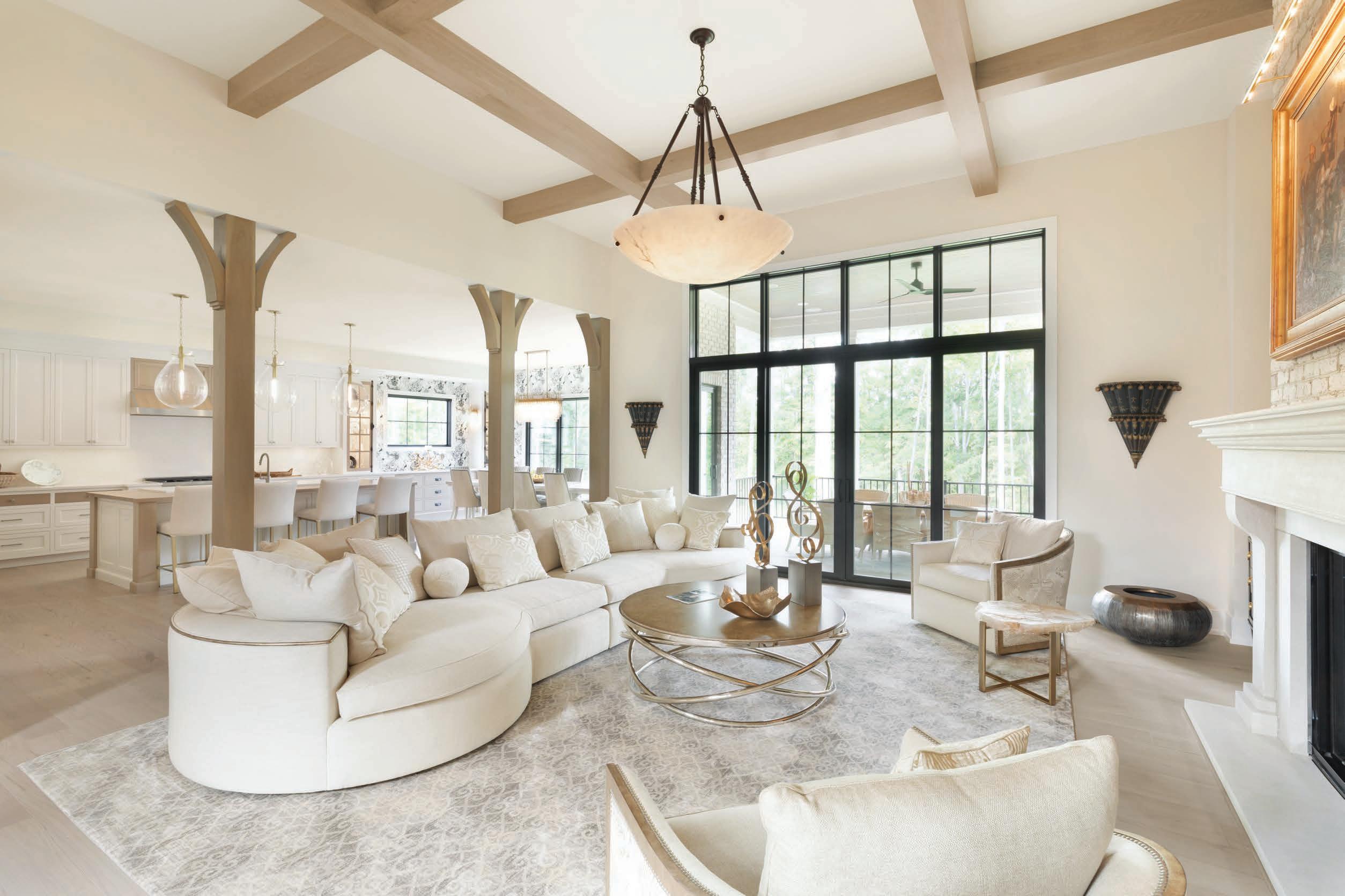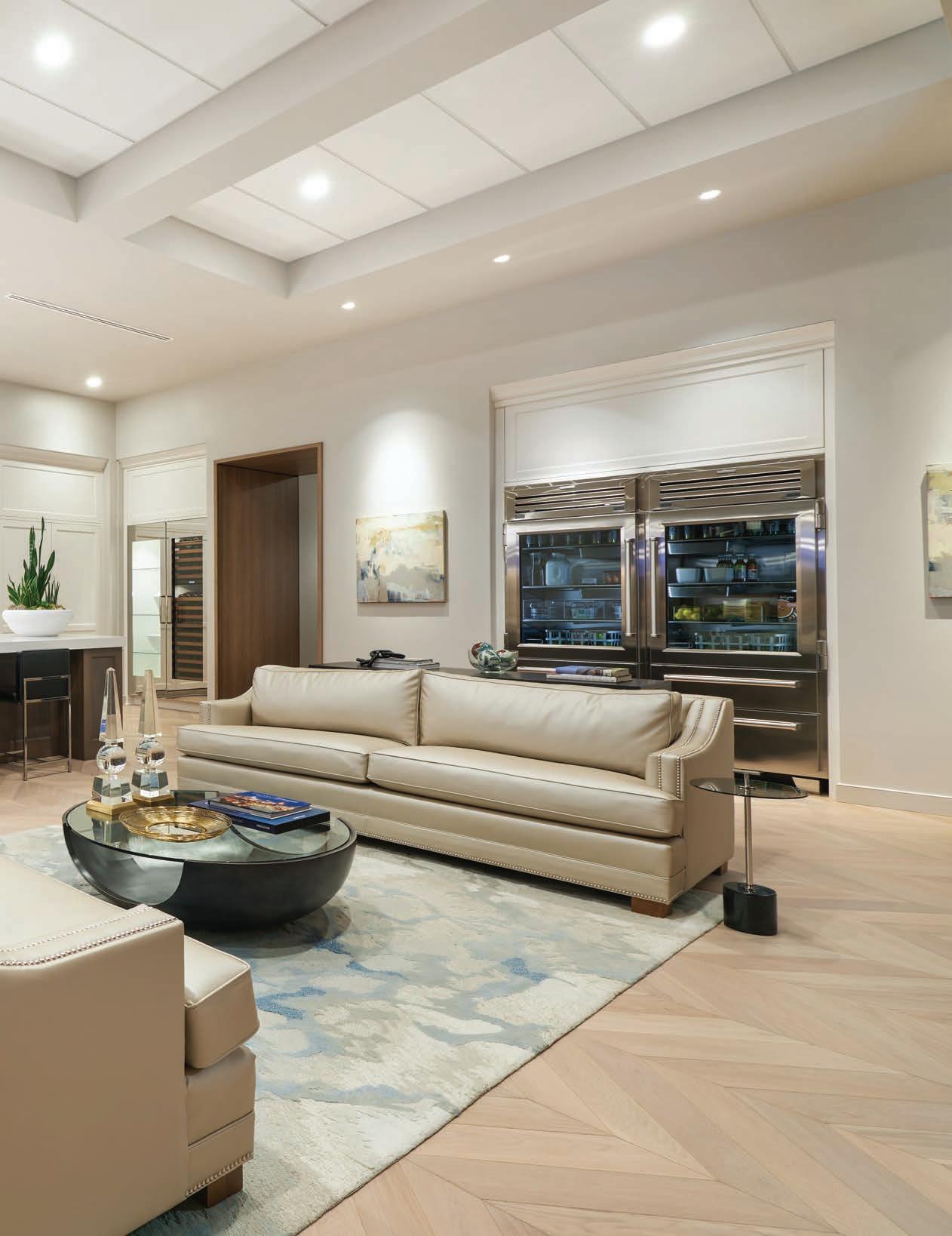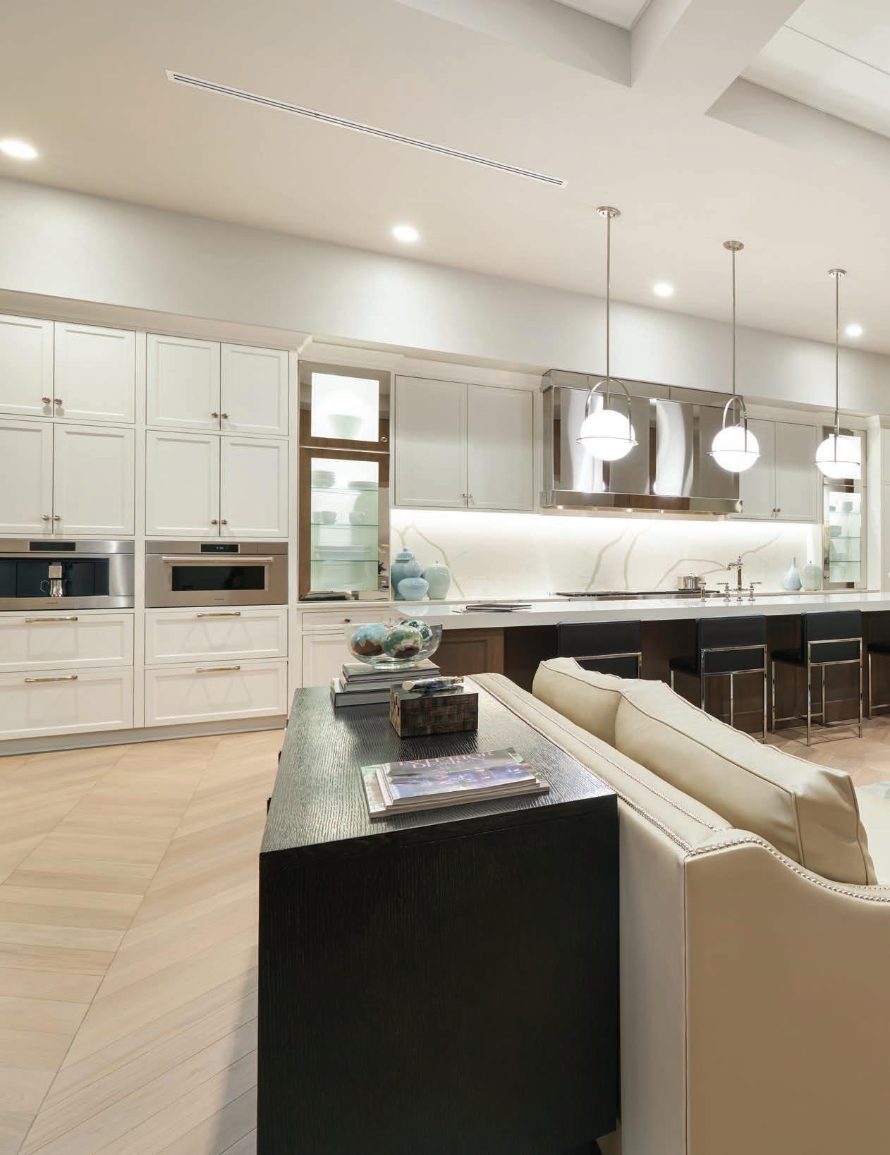 Within the beautifully designed traditional kitchen vignette with accompanying living space and dining area, the appliances are seamlessly integrated with custom paneling and purposeful layout to allow for natural everyday kitchen use.