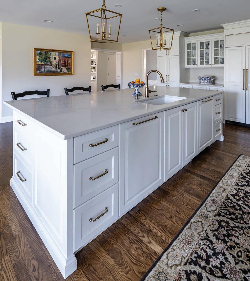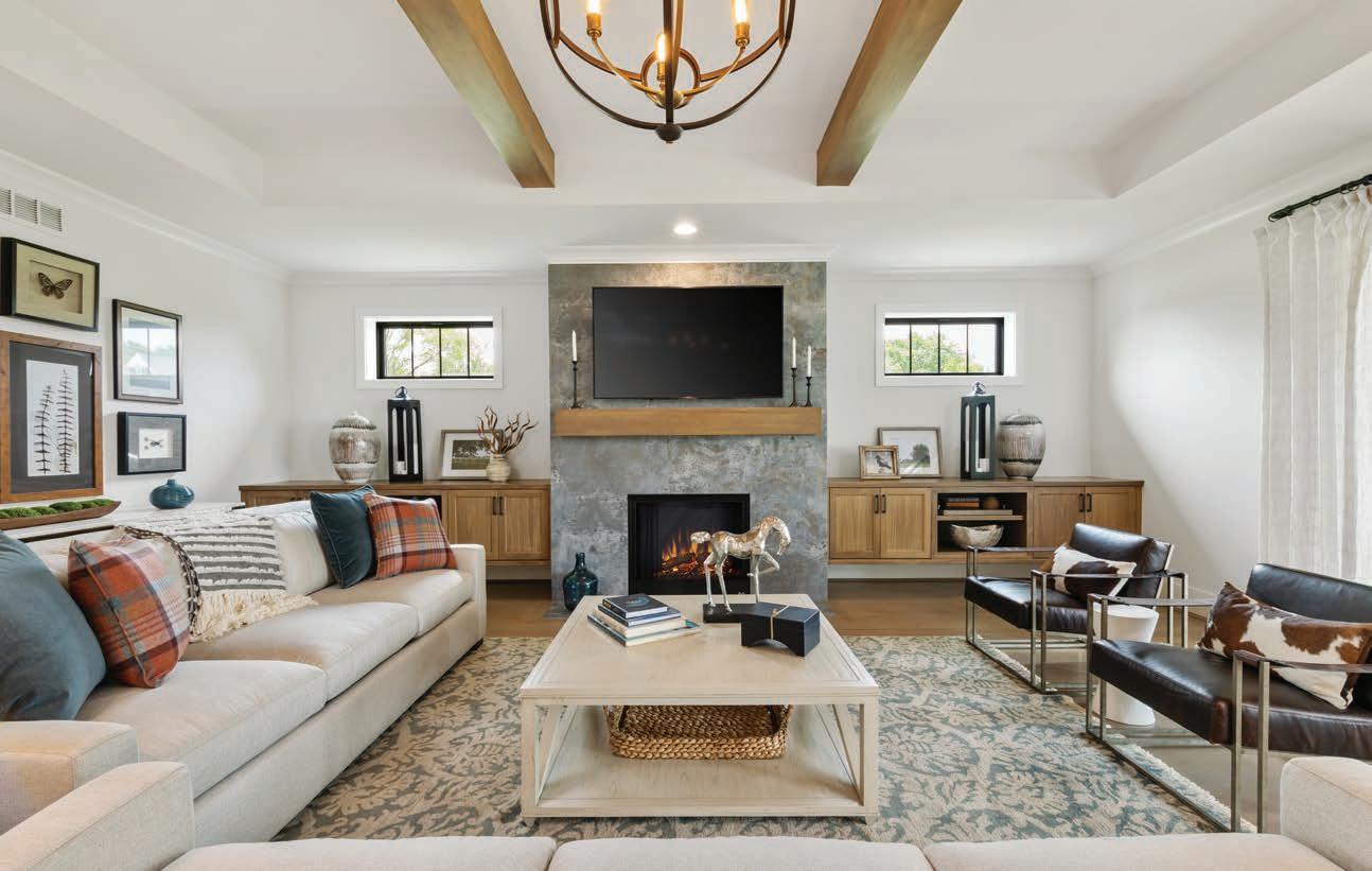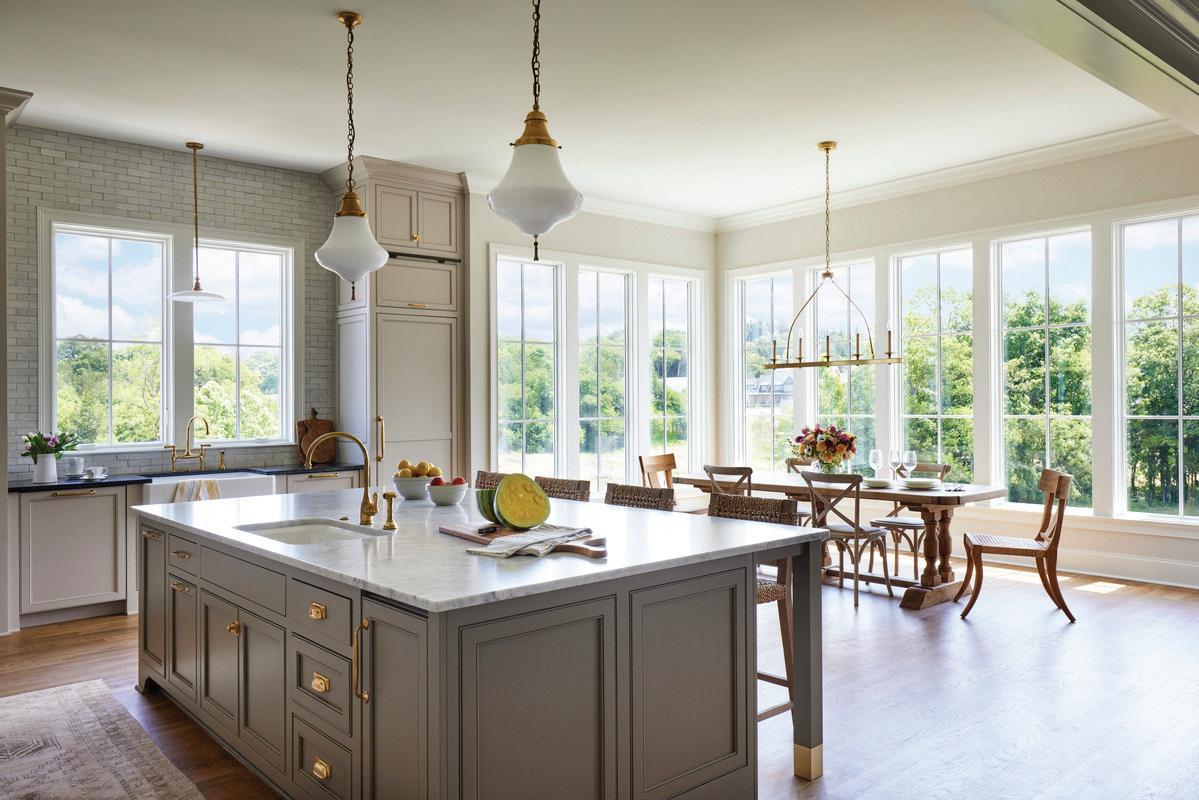 Within the beautifully designed traditional kitchen vignette with accompanying living space and dining area, the appliances are seamlessly integrated with custom paneling and purposeful layout to allow for natural everyday kitchen use.