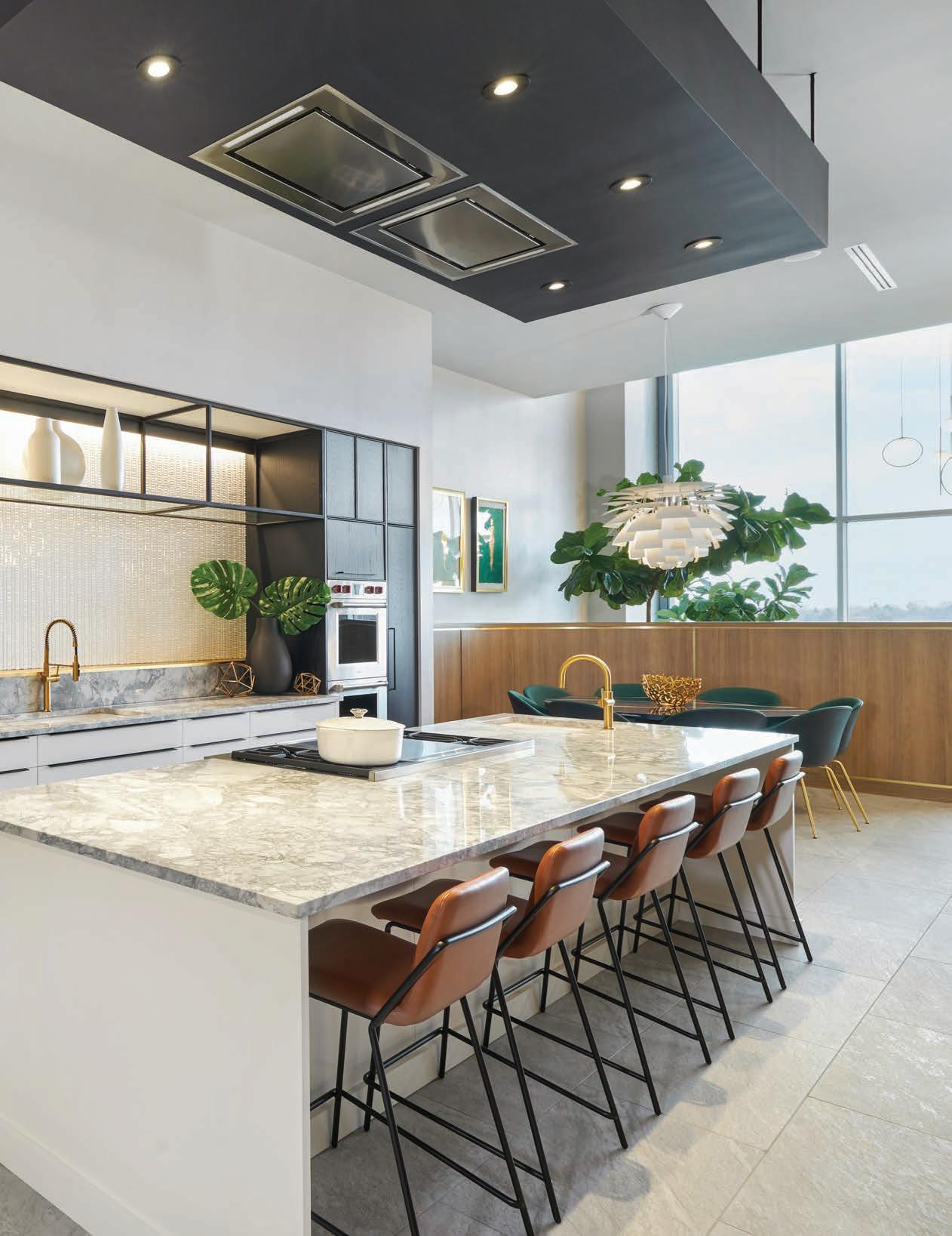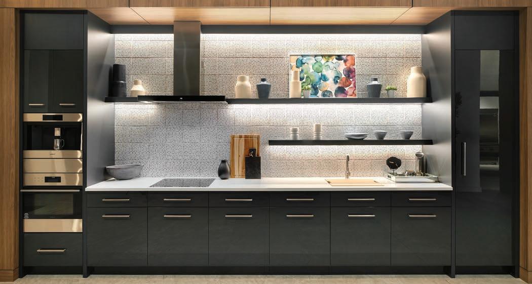 A small-space vignette highlights ideal products for guest suites, pool houses, and lower-level kitchens. Space saving 24” convection ovens, refrigerator columns, and induction cooktops are displayed in a compact design.