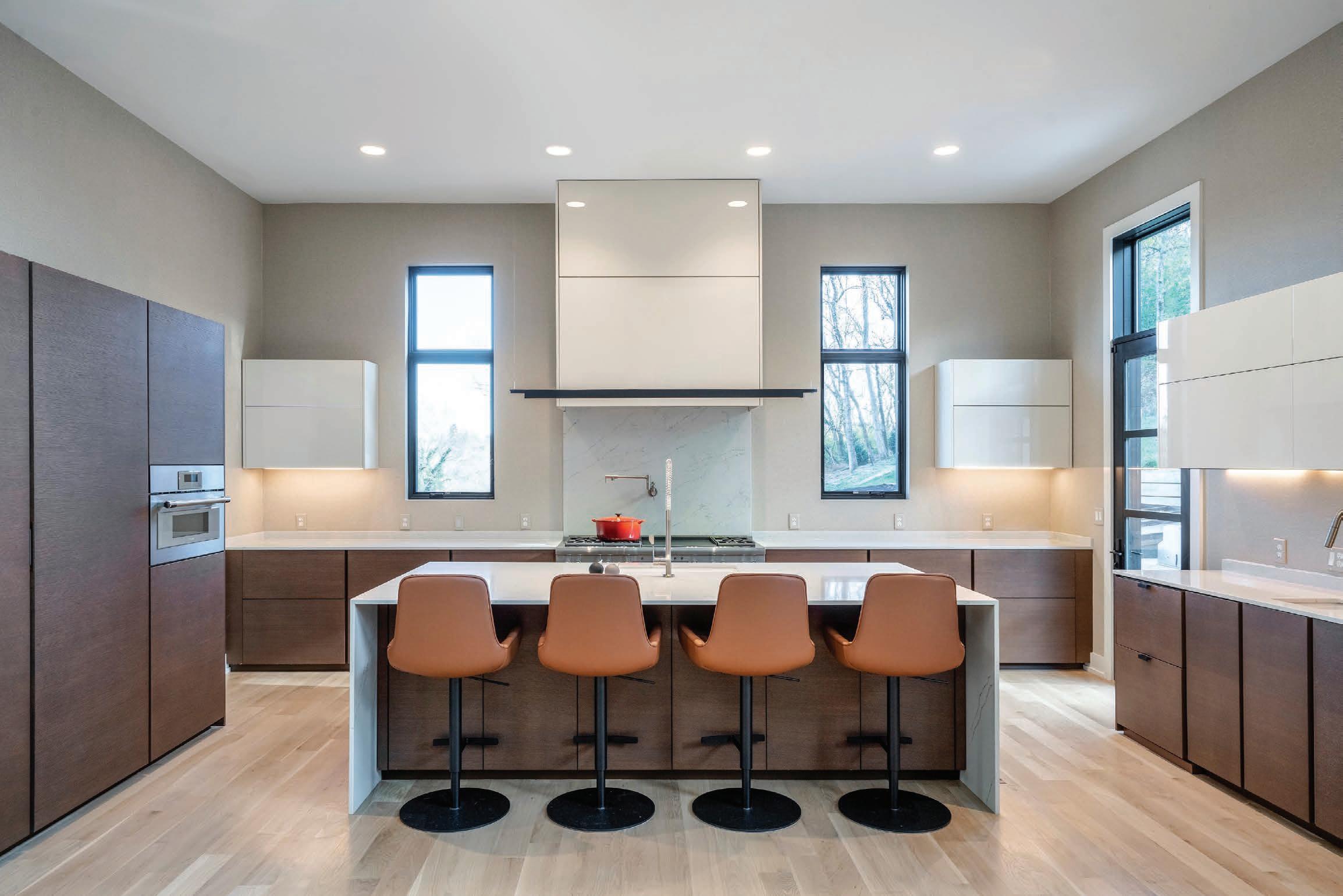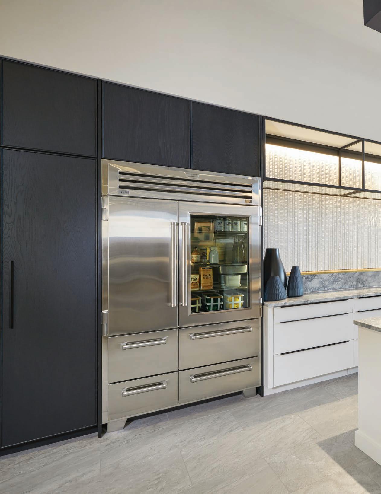 A contemporary vignette features concealed hardware, so even the most substantial Sub-Zero refrigerator is completely integrated in this minimalist design. Double installation of touch-to-open ovens, paired with matching handle-less convection steam ovens and an integrated dishwasher with a custom panel maintains the cohesiveness of the sleek design.