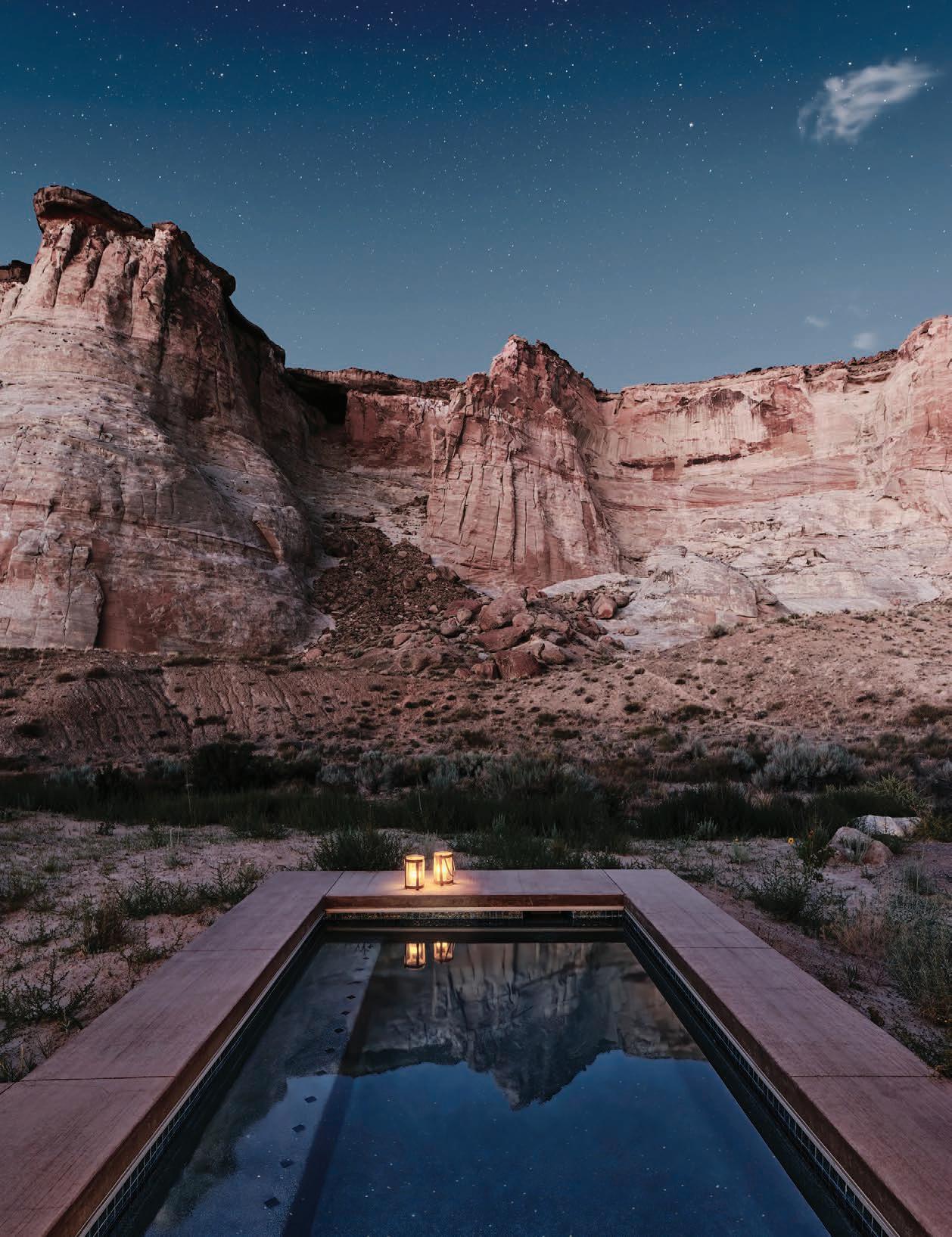 Anyone with deep enough pockets can construct a jawdropping luxury resort, and there has certainly been no shortage of such properties featured on the pages of this magazine over the past two decades. What truly distinguishes Camp Sarika and Amangiri is how its physical structures are nearly indiscernible from the landscape in the protected valley in which it's nestled, dwarfed by lofty flattopped mesa rock formations carved over millennia through the random interplay of water and wind. It's also the way the property touches on all the senses as an homage to Native American culture and the desert's desolate beauty, from the subtle scent of sage to the