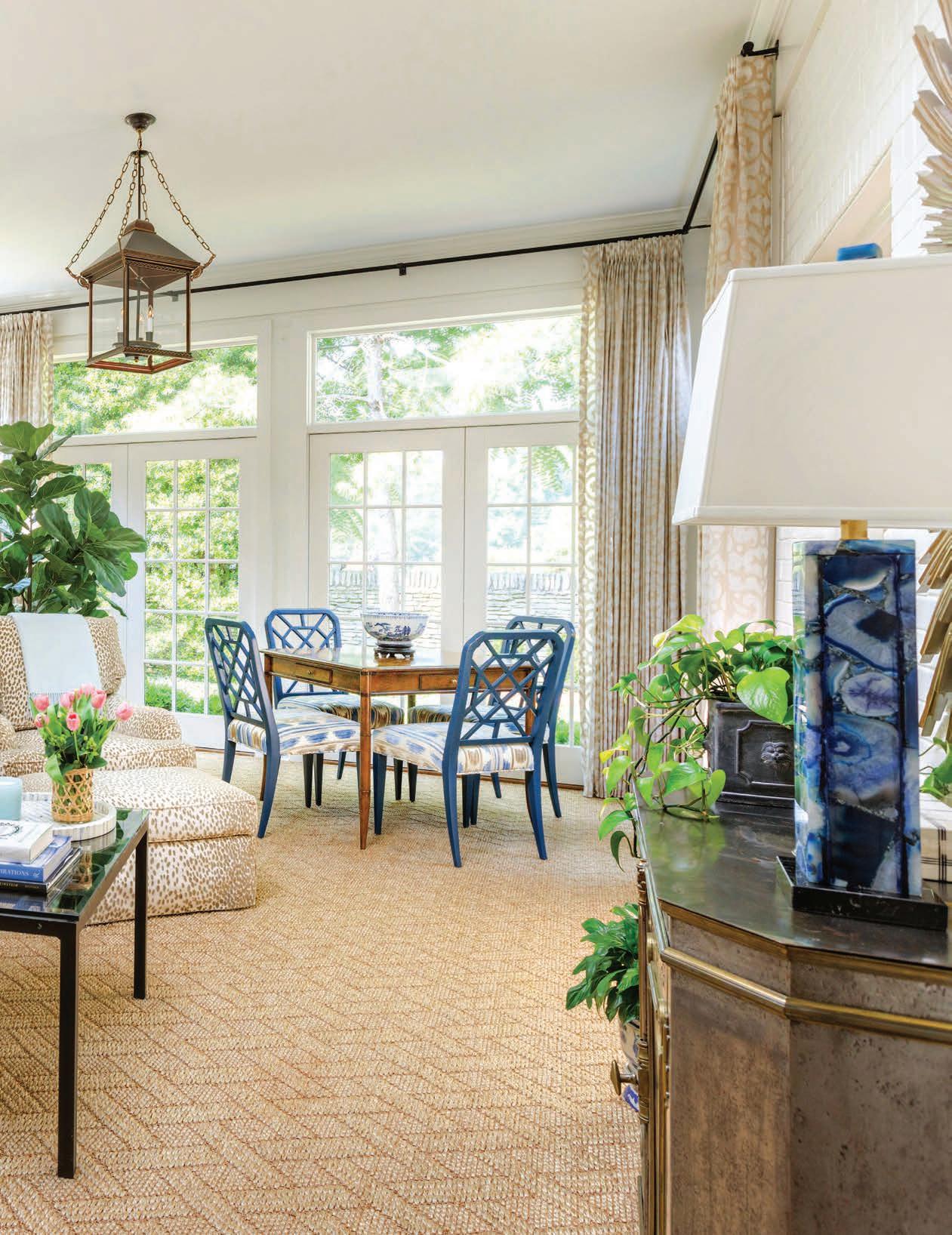 The home is the kind of place where the layers reveal themselves the longer you linger. On my second pass though the light-filled family room, I noticed that the base of a lamp placed beneath a gilt wood starburst mirror is comprised of blue agate slices. The space is more casual but still playfully elegant with brick walls painted white, chinoiserie accents and pops of blue.