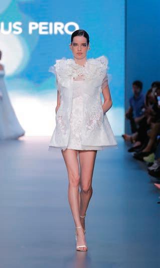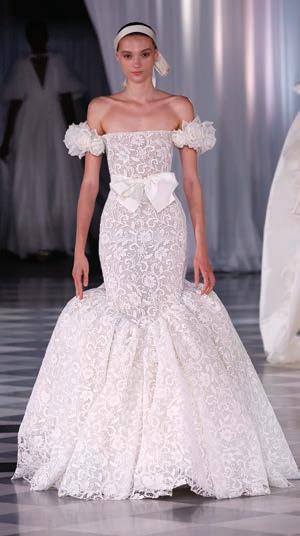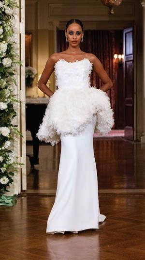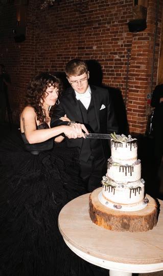 and groom's initials and the wedding date. The reception dress was an Alençon lace corset fit and flare gown that Rita characterizes as "diaphanous". The bride's final ensemble, donned for cutting the cake, was a black strapless gown with a voluminous layered tulle skirt that transformed into a short party dress, symbolizing the evening's exuberant joy.