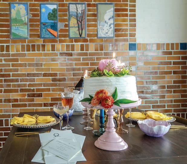 This page, top: Cake stand and wedding invitation from Cartwheels; cakeflowers from Spirea Floral. Middle: Photo album on bed fromCartwheels Papers & Gifts. Bottom: Roberto Coin VenetianPrincess diamond bracelet and 2.10ct two-stone lab growndiamond engagement ring from Davis Jewelers.