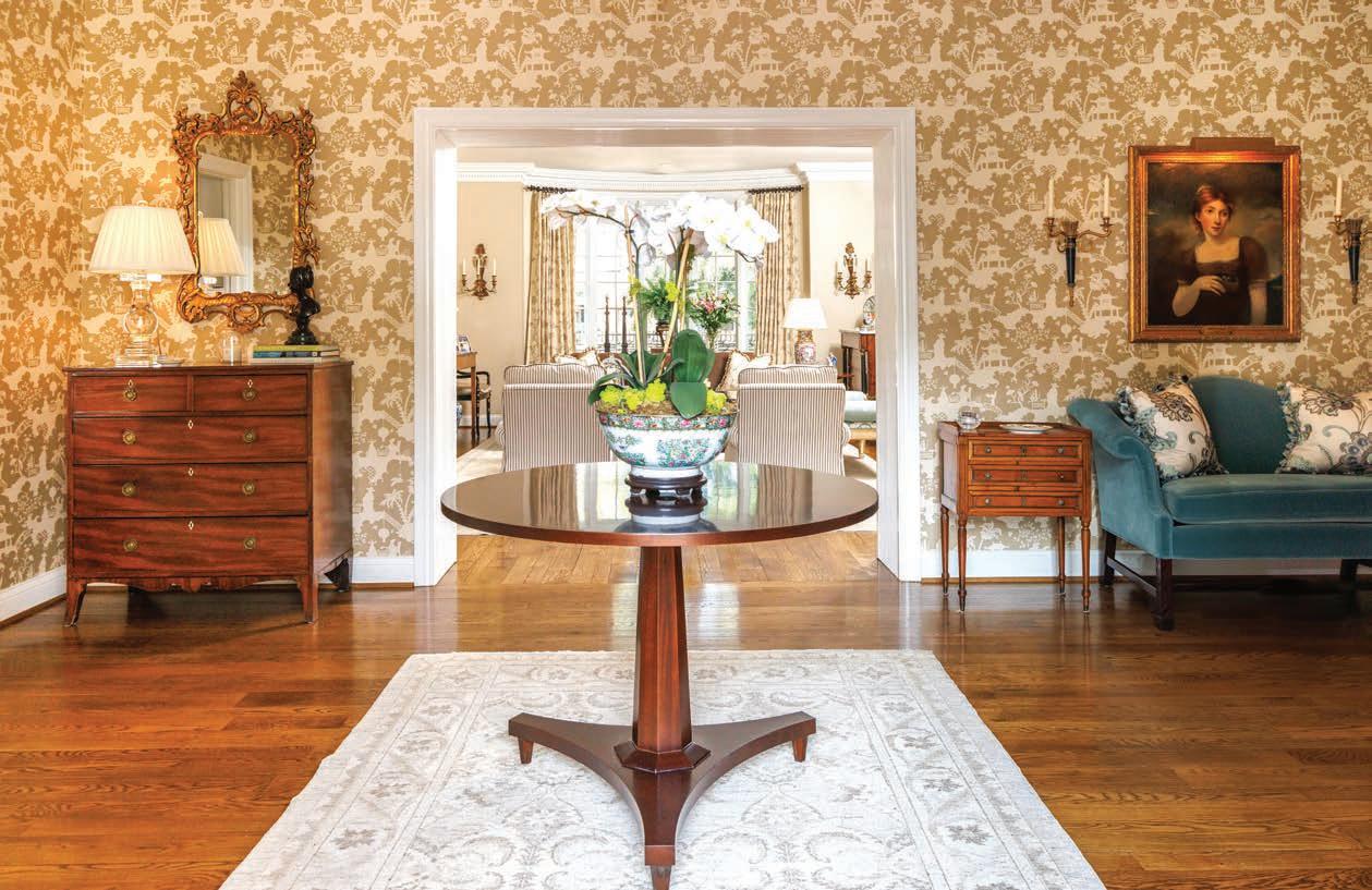 The foyer is defined by toile wallpaper, which continues into the first and second-floor corridors. The gracious space incorporates pieces from the homeowners’ antique collection, including a Georgian chest and a gilt wood chandelier.