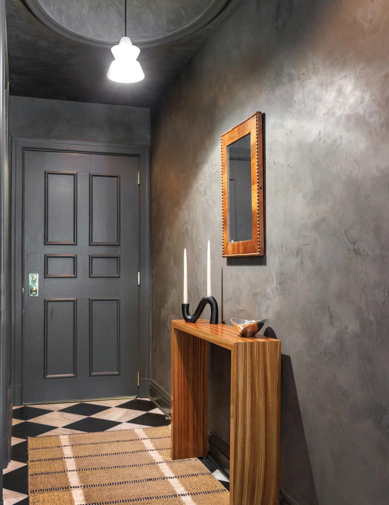 Existing built-ins in the vestibule are amplified with a folk-art-style paint pen motif by Relativity Textiles inspired by Morris & Co. wallpaper. “I