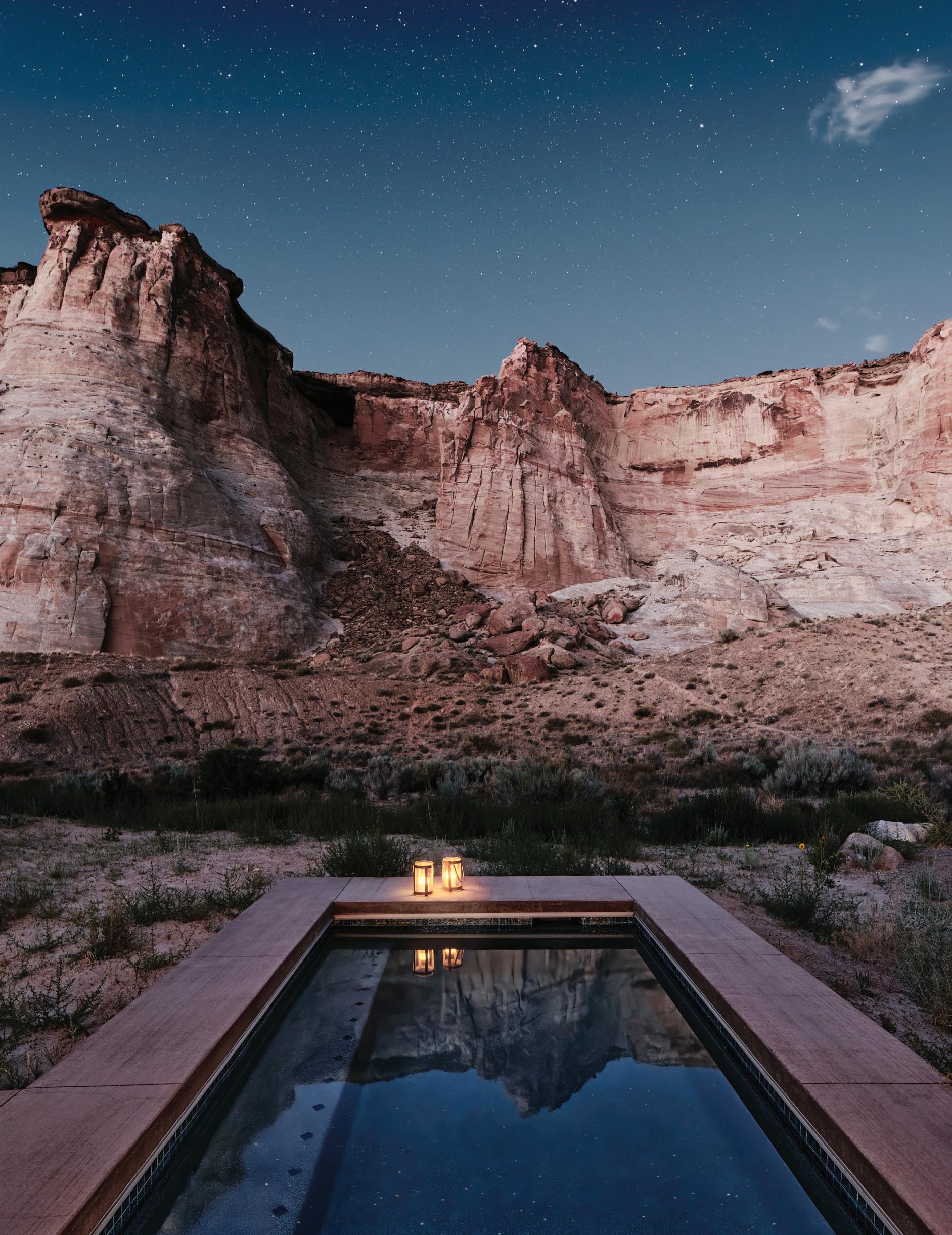 Anyone with deep enough pockets can construct a jawdropping luxury resort, and there has certainly been no shortage of such properties featured on the pages of this magazine over the past two decades. What truly distinguishes Camp Sarika and Amangiri is how its physical structures are nearly indiscernible from the landscape in the protected valley in which it's nestled, dwarfed by lofty flattopped mesa rock formations carved over millennia through the random interplay of water and wind. It's also the way the property touches on all the senses as an homage to Native American culture and the desert's desolate beauty, from the subtle scent of sage to the