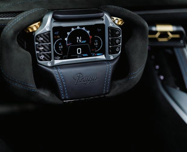 interior comprising carbon fiber, Alcantara and leather that can comfortably accommodate two 6.5-feet-tall adults. The narrow cockpit boasts a fully adjustable driver's seat, steering column, and pedal box. The custom steering wheel, which incorporates a sizeable digital display, is removable for easy entry and exit. The slim center console, launch control, built-in fire extinguisher trigger, and electronic parking brake are located within the slim center console. Hearkening to Praga's aviation division, the airconditioning controls are mounted in a 'fighter jet' style roof console.