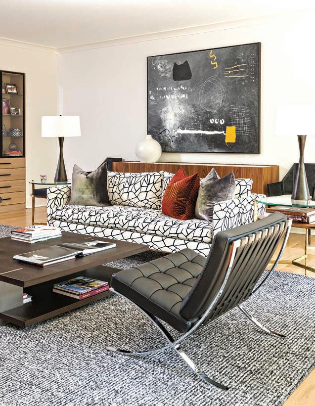 A wide doorway beckons guests into the formal living room, a study in contrasts. Painted black, the wall surrounding the hearth highlights a pair of armchairs with lively orange upholstery and a punchy Warhol print depicting Mick Jagger. Procured from the Bittners showroom, the wife spied it reflected in a photograph of a mirror Wolz had sent her. Bridging the transition to the opposite wall, painted ecru, is a graphic black-and-white upholstered sofa. Built-ins on either side of the doorway, updated with white oak and black hardware, along with a pair of black Barcelona chairs, serve as threads in an overarching tapestry of mid-century design.