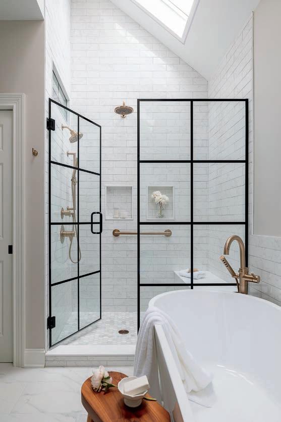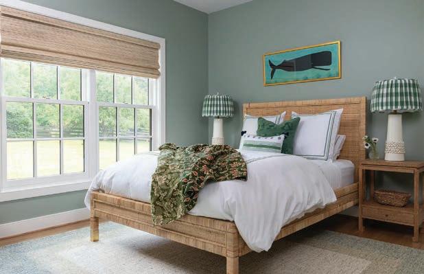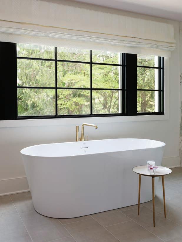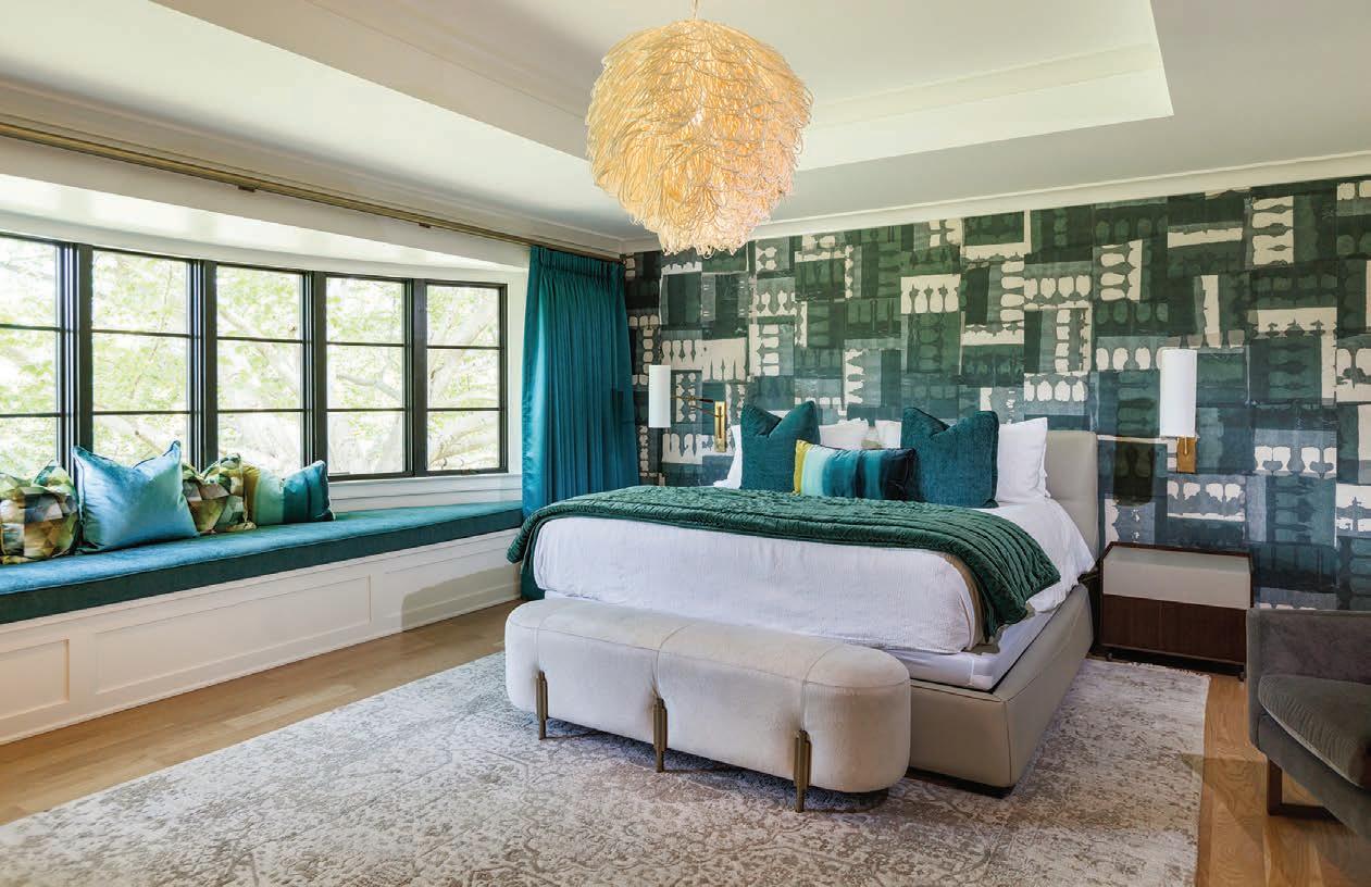 the fireplace and splits sections of white oak paneling. A round plinth table pulled up to an existing window seat updated with blue velvet upholstery is ideal for family game night. A sectional with linen-colored upholstery offers seating without detracting from the etherealness. The wallcovering Wolz selected for a pair of powder rooms and the primary suite answers the homeowners' call for drama. An abstract collage in shades of green enlivens the primary bedroom, with colors pulled from the print for the drapery and upholstery on the window seat. The spa-like primary bath turns down the volume with a palette limited to shades of white and grey and accentuated with gold hardware and fixtures.