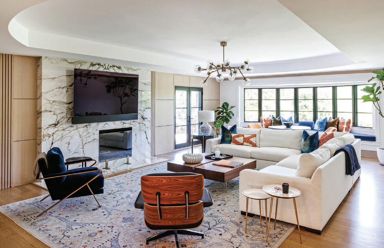 Wolz added smoked glass mirrors to the upper cabinets in an existing wet bar, bridging the space between the kitchen and the family room. In the latter, a generous slab of richly veined marble surrounds