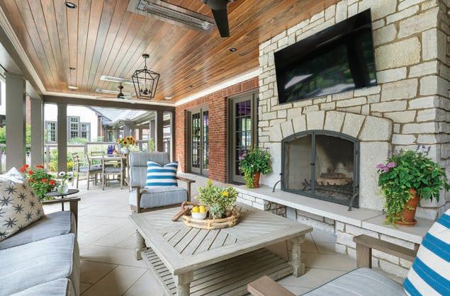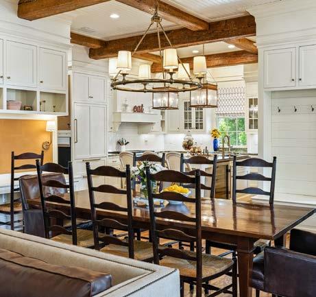 A large, covered terrace outside the pool house boasts a finished wood plank ceiling with integrated heaters and a fireplace. Several sets of French doors open into the kitchen, living, and game rooms. A vaulted ceiling with exposed beams adds to the feeling of spaciousness. Resisting the usual beachy and sometimes kitschy vibe typically bestowed upon these auxiliary structures, Reynolds leaned on a subtle Provençal theme inspired by the homeowner’s lavender cutting garden and a coffee-table book about France’s famed southeastern region. Reynolds remarked that the wife has a design background and was actively involved in the project. “It was fun to collaborate,” he added.