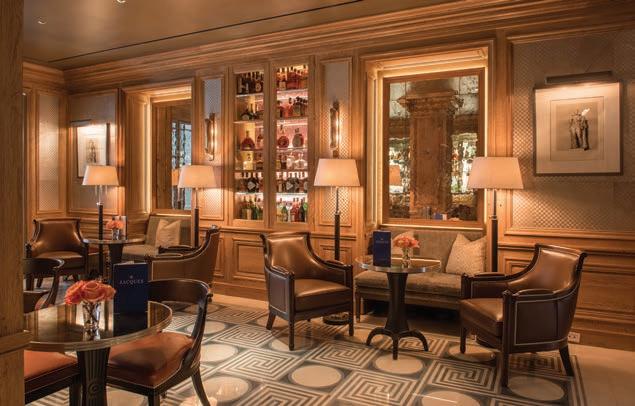 Arched French doors at the rear of the Club Room provide a view into the glass-ceiling orangery at Majorelle, The Lowell's elegant French/Mediterranean restaurant. Resplendent with a groin vault
