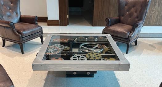 To enhance our architectural and interior design work, we created custom furniture pieces for M1 Bank that reflected the project’s themes. Bank vault items and visuals were used, such as locks, gears and levers. The boardroom table recalls the visual of solar panels, which is in reference to one of the bank’s biggest investment clients. The palette of materials, colors and textures has been refined over three projects for M1, allowing us to further develop the design language we established for their brand.