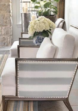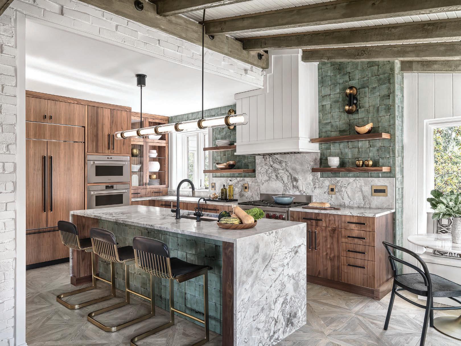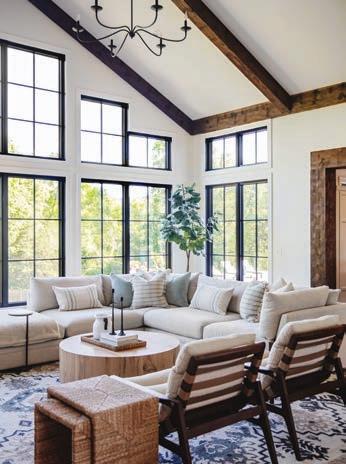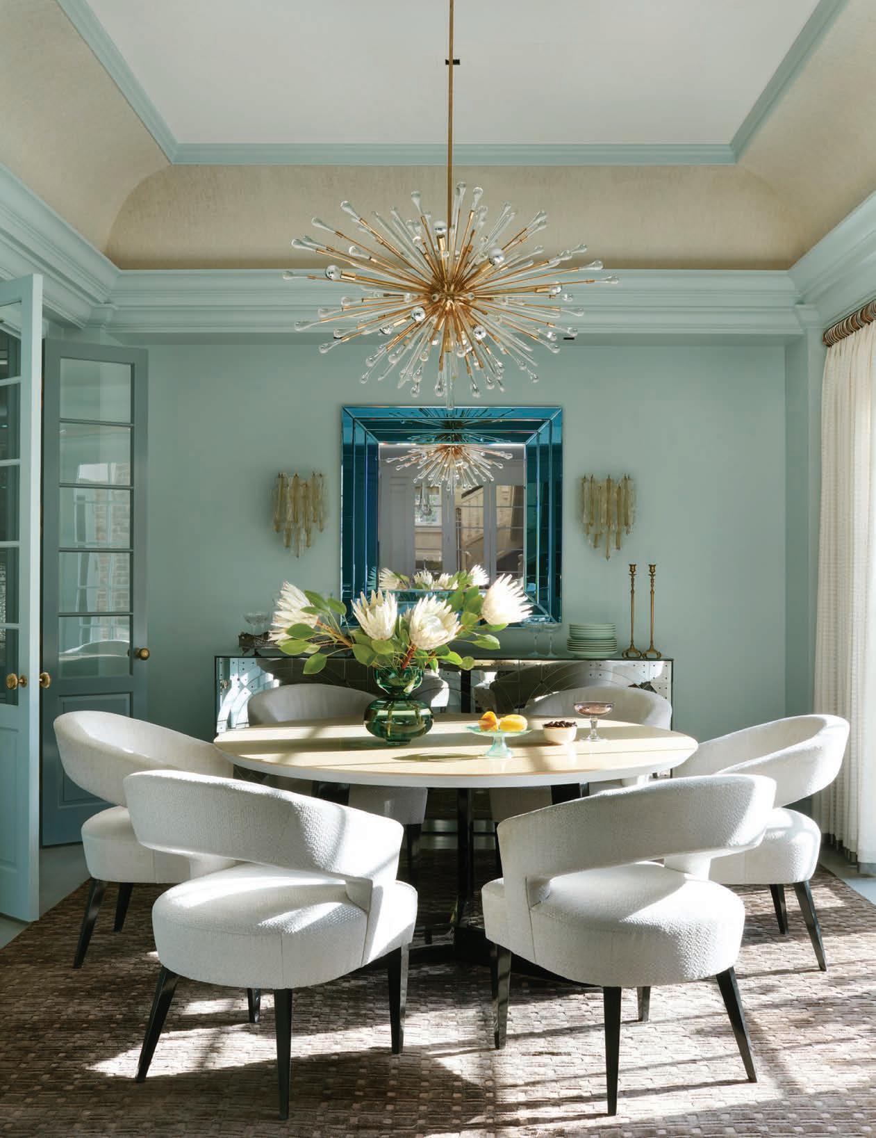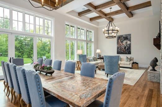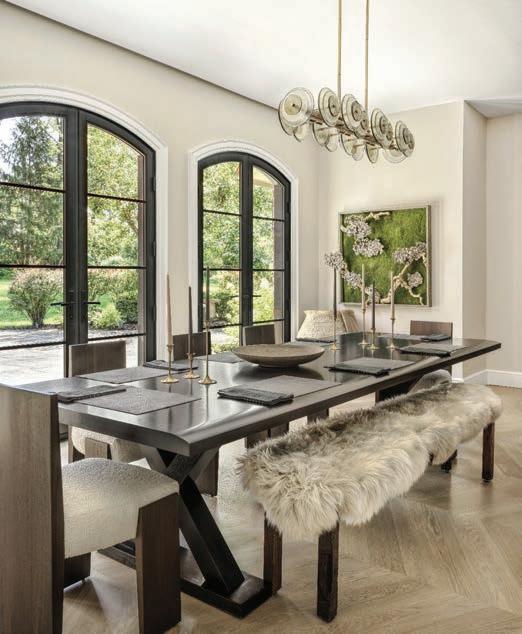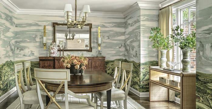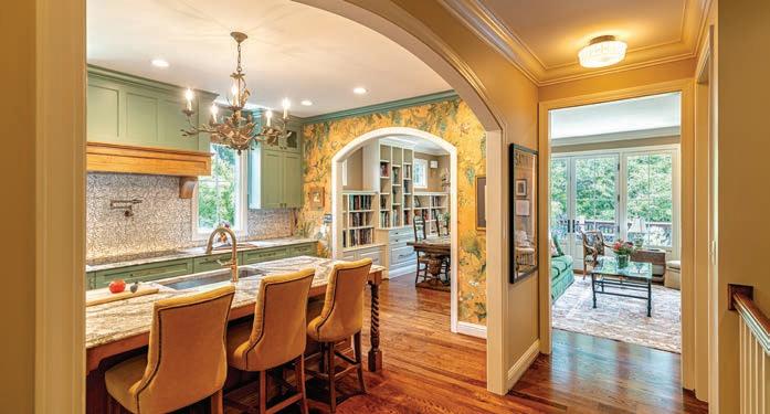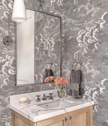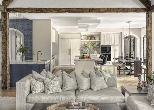 The goal of the design project was to improve the flow and functionality of the home by combining the kitchen and dining areas, deleting the closed off traditional dining room from the floor plan and creating an open-concept floor plan to the great room, making this open floor plan home inviting for hosting guests to gather and still comfortable for a couple entering the next phase of life as empty nesters. The updates to the home included new flooring, finishes, fixtures, appliances, lighting, cabinetry and furniture. Opening up the floor plan presented challenges, such as aligning ceiling heights, optimizing lighting and ensuring the correct allocation of square footage between functional zones and decorative areas. The design style maintains many of the interior architectural elements of the home’s original aesthetic. This was accomplished by adding a new furniture layout and furnishings to the main spaces, with tailor-made seating around a large-scale coffee table centered under a two-tier iron chandelier, which grounded the volume of the great room. This created a main space in the home conducive for gathering many people or stretching out to watch TV. The far side the main level is the living room, now arranged for entertaining conversations or putting your feet up to read. From the master suite to all corners of the main level there is a seamless flow of design elements. The home has a modern spin within the traditional framework, clean and contemporary and still rooted in tradition. Bold textural handmade elements throughout the spaces, from area rugs to throws and upholstery, bring interesting details that blend into the calm color palate. With pops of wow in the small space, the powder room stays balanced with a harmonious connection to the sophisticated overall design of the home, which meant every choice needed to be intentional. Photography by Alise O’Brien