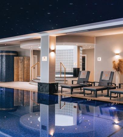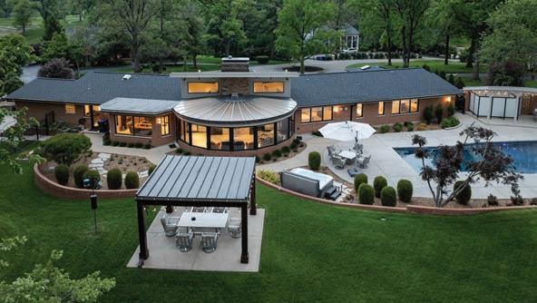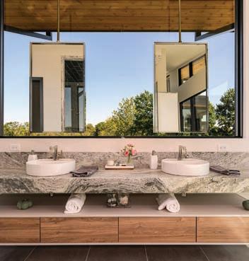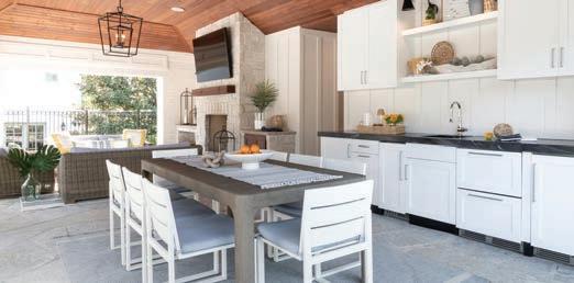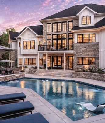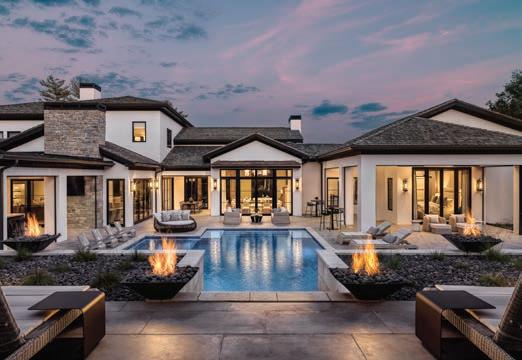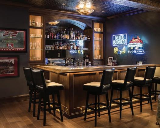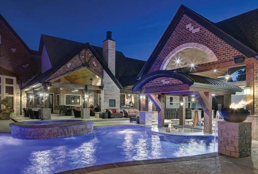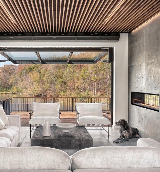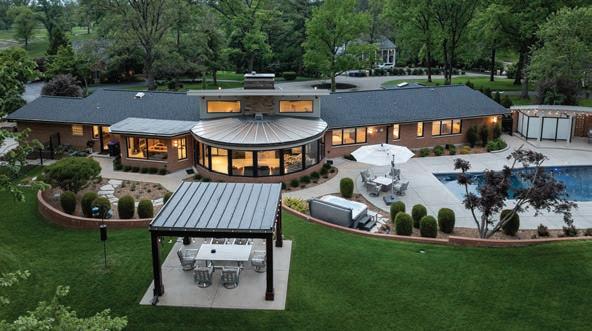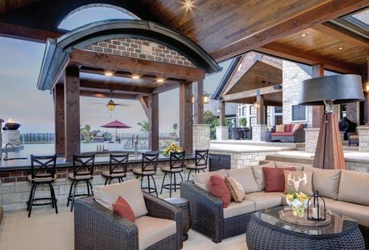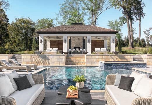 Set high above the banks of the Mississippi River, this 2,000-square-foot pool pavilion redefines luxurious outdoor living. Designed to celebrate the natural landscape while connecting seamlessly to the existing home, the pavilion blends bold entertaining elements with cozy retreat spaces — all positioned to frame breathtaking panoramic views and eagle watching. The design was driven by a client who entertains year-round, from relaxed poolside gatherings to football nights under the stars. At its heart is an open-air sunken living room anchored by a 98-inch TV and flanked by two sculptural laser cut metal fire columns — custom-designed to glow without blocking views, creating a dramatic focal point day or night. Adjacent to this vibrant hub is a quieter sitting room, perched a few steps higher, around a full-height stone fireplace, offering a cozy hideaway that remains visually connected to the landscape and larger gathering space. One of the pavilion’s defining architectural features is its movable glass wall system in the upper sitting area. A resort-style 35,000-gallon pool with a sun shelf invites lounging and conversation, while a custom whirlpool spa cascades elegantly into the main pool, offering a waterfall sound and movement. Three fire-and-water bowls punctuate the scene with flickering drama and balance. The true showstopper, however, is the fully integrated swim-up bar. Equipped with two draft beer taps, a kegerator, undercounter refrigerator drawers, ice machine and generous granite counter space and stainless-steel cabinets, the two-sided bar serves both swimmers and guests lounging poolside — making it the centerpiece of summertime entertaining.
