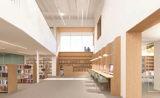 A beloved neighborhood institution, this independent community library recognized the need to expand its footprint and offerings to better serve both local residents and the surrounding region. Extensive engagement with the board, staff and patrons informed a design vision rooted in the library’s mission: to provide a place for the community to connect, learn and grow; to foster a love of reading and lifelong learning; to ensure free and open access; and to celebrate knowledge, history and culture. The 16,000-square-foot project included the renovation of an existing 10,000-square-foot two-story building and a 6,000-square-foot addition. Serving as a dynamic new entry, the addition floods the interior with natural light and introduces welcoming spaces for public gatherings, teens and children. An outdoor courtyard extends the reading areas, offering a flexible venue for everything from play and dining to book clubs and community events. By retaining the existing structure, a former office space and parking garage, the design reduced demolition waste while honoring the building’s history. The existing façade was maintained, with previous openings repurposed as circulation links between old and new. The primary architectural intervention is a central circulation spine, where portions of the second floor were removed to create a light-filled atrium connecting both levels. Strategically placed roof monitors draw daylight deep into the building, creating a bright and welcoming atmosphere. A cohesive material palette of concrete floors, white walls and warm white oak ties the spaces together. Each age group’s zone retains its own identity through distinct furnishings and color accents, while cozy alcoves carved into the walls provide calm moments for reading and reflection. Flexible, movable furniture accommodates the diverse needs of the community and layered lighting solutions offer both aesthetic highlights and functional control. Acoustic treatments integrated into ceilings, alcoves and wall features ensure comfort for visitors of all ages.