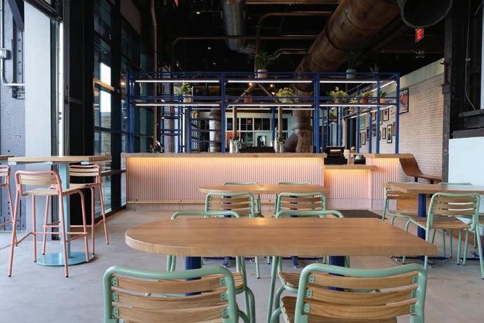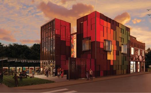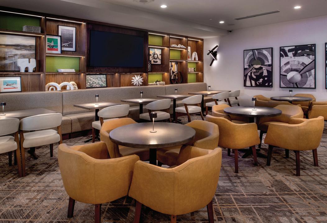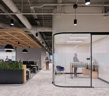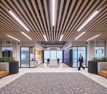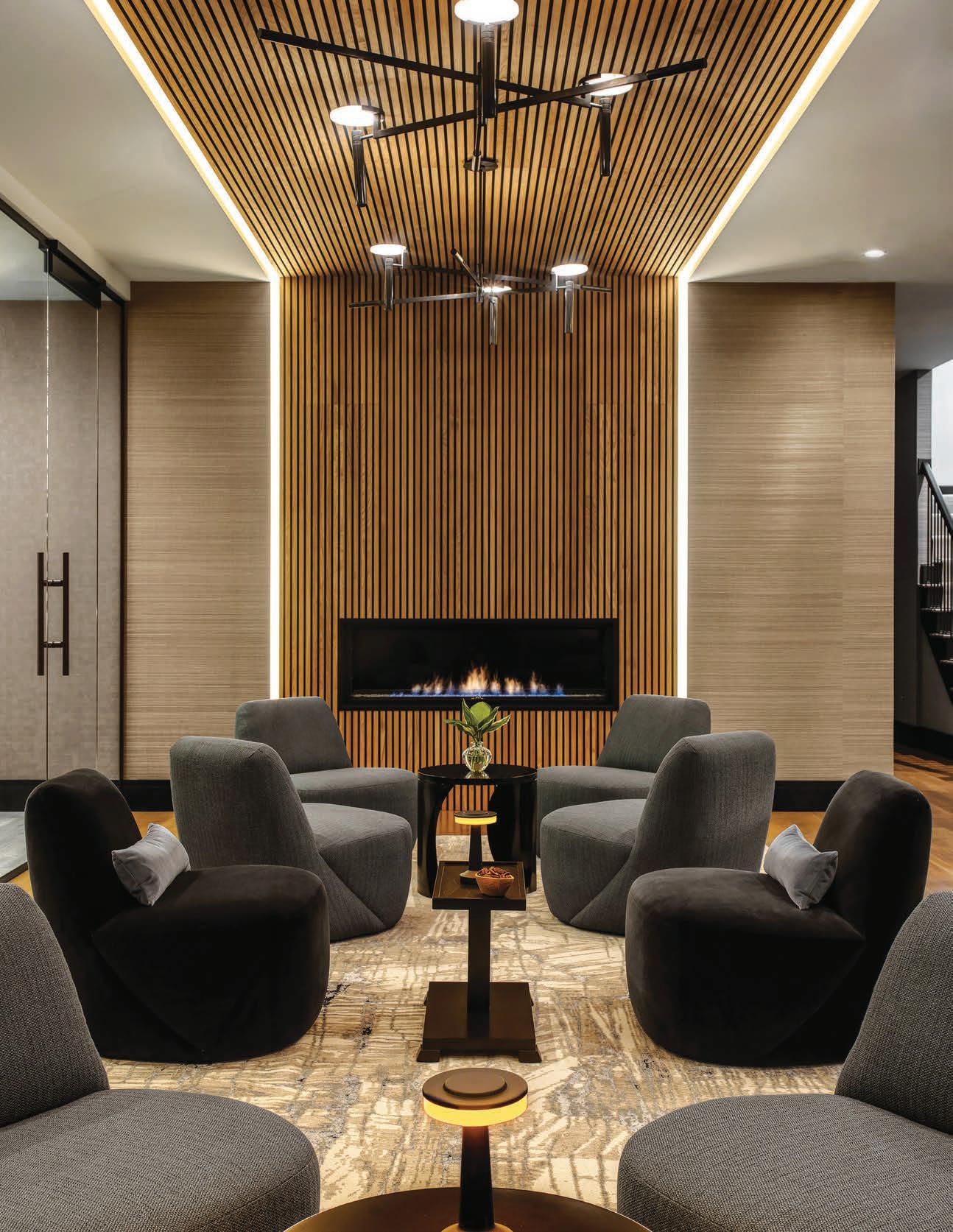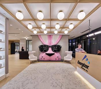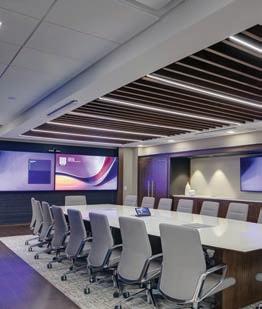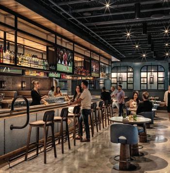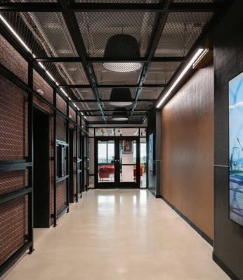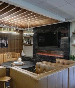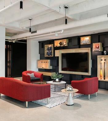 This project transformed two floors of mixed-use space, formerly housing a restaurant and bar, into an immersive retail destination for a global sporting goods brand. The flagship extends beyond the sale of merchandise, celebrating the brand’s deep connection to baseball and its visibility as a St. Louis-based company since 1887. Solutions to merge two tenant spaces into a cohesive, stadium-like atmosphere included extending the storefront 20 feet, adjusting patio elevations and creating a 26-foot-by-26-foot vertical opening between floors, anchored by a grand staircase that unifies the space and serves as a visual focal point. The design concept focused on stadium-inspired design elements –open, exposed levels, polished concrete, black fencing, woodgrain textures and a dynamic LED scorecard ribbon between floors – transporting visitors to a nighttime baseball game. Red and white accents capture the leather and stitching of the classic baseball and glove, tying in the brand’s iconic visual identity as you move throughout. Custom display cases filled with artifacts, an interactive timeline of milestones and moments in baseball history and wall graphics celebrating the company’s craftsmanship build excitement and a sense of discovery. Two floors of merchandise fully immerse shoppers in the brand, including nearly 200 baseball gloves displayed across two walls and illuminated with custom lighting and the Bat Zone lounge, offering hundreds of bats for shoppers of every age and skill level. Adding a batting cage in a mixeduse facility introduced acoustic concerns. Soundproofing solutions included insulated wall cavities, isolated drywall framing, acoustic panels, high-STC ceiling tiles and coverings over penetrations. Astroturf and carpeting further reduced sound transmission while enhancing the look and feel of a ballfield. Photography by Karen Palmer Photography