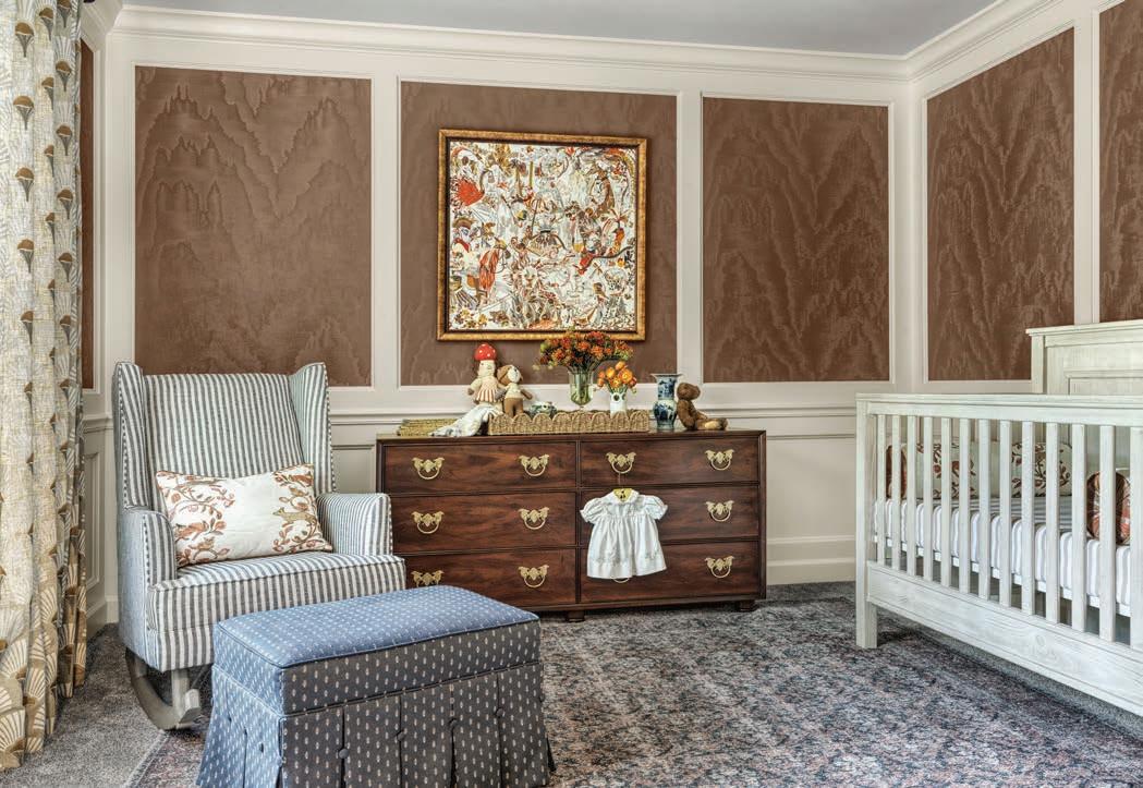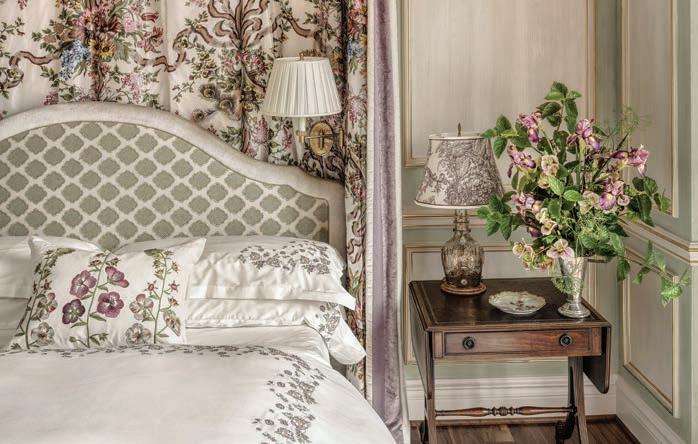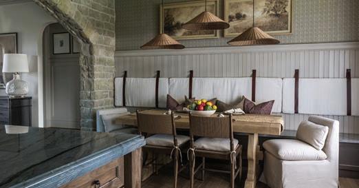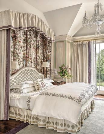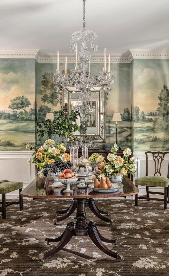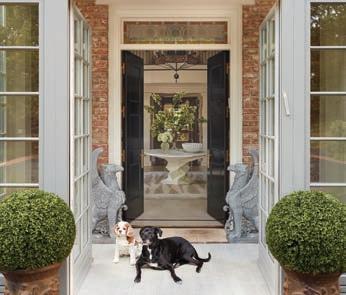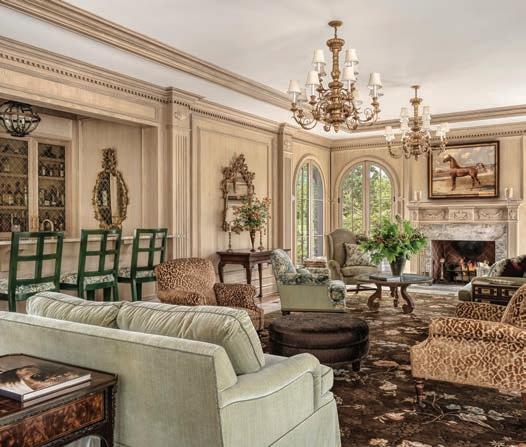 A new English-style brick manor house with an attached stable carriage house sits right in the middle of old Saint Louis fox hunting and polo fields, allowing views of the countryside, hills and meadows out each window. Horses, American foxhounds and the owners feel right at home amidst the cabochon studded limestone floors, limed oak paneling and hand painted murals referencing the landscape outside. Candlelit Georgian Irish crystal chandeliers, antique gilt mirrors and English mahogany furniture bounce the daylight off the bespoke silk and wool carpets incorporating the owners’ pets in the intricate patterns. A large elegant great room spanning the entire length of the house allows for easy and relaxed gatherings; with its open floor plan incorporating an expansive bar niche and working kitchen with views to the stable yard right outside. Wrought iron balustrades lead upstairs to a luxurious primary suite anchored by a fantastical bed which is surmounted by a baldachin of French silk fabric originally commissioned by Marie Antoinette. English and Italian embroidered bedlinens assure a blissful night of sleep over this enchantingly designed realm. Photography by Alise O’Brien