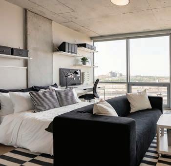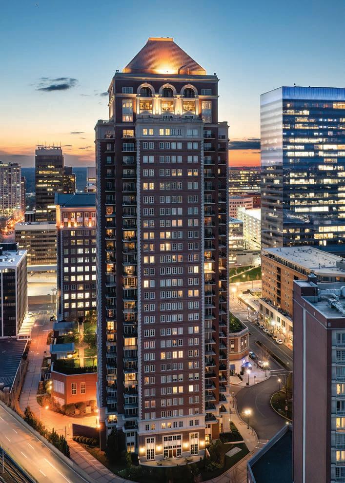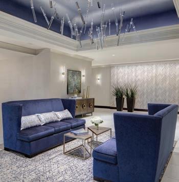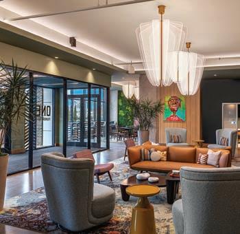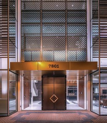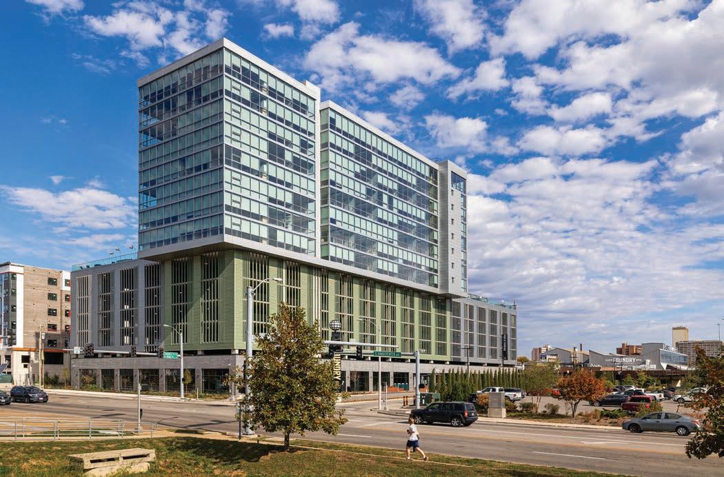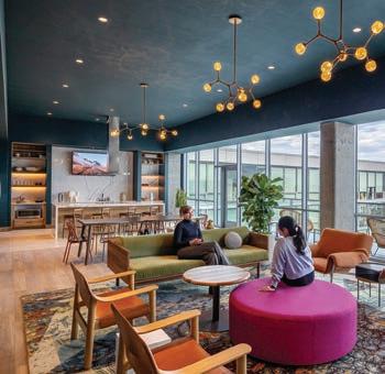 One Foundry Way marks the latest chapter for City Foundry STL, bringing the first market-rate, high-rise apartment to Midtown St. Louis in nearly half a century. The mixed-use development, which serves as a gateway entry to City Foundry along South Vandeventer Avenue, features eight levels of luxury apartments anchored by two outdoor amenity decks, six floors of structured parking and 12,500 square feet of street-level retail. Incorporating high-end design was central to the project goals, with the feeling of “luxury” defined by the experience upon entering the building. Staff welcome guests and residents from the striking reception desk, while the vibrant lounge area invites visitors to gather and unwind, incorporating biophilic design elements such as a preserved moss wall throughout the space. Hospitality was key in defining luxury, informing many of our final design decisions. The robust onsite amenities (including features like an elevated outdoor pool, gym, chef’s kitchen and dog run) provide multiple opportunities for residents to engage with neighbors and guests while furnishing variety from typical residential settings. The highly designed apartment units maximize the efficiency of the spaces and include conveniences such as in-unit washer/dryers and an access control key fob entry system for added security. One Foundry Way serves as a design showpiece while reflecting the vibrant style displayed throughout City Foundry. Residential units are located in two offset glass masses, creating a playful relationship between the amenity decks and building structure at large. The floor-to-ceiling glass exterior affords 360-degree views to the surrounding metro area, placing residents in the thriving heart of St. Louis.