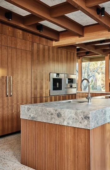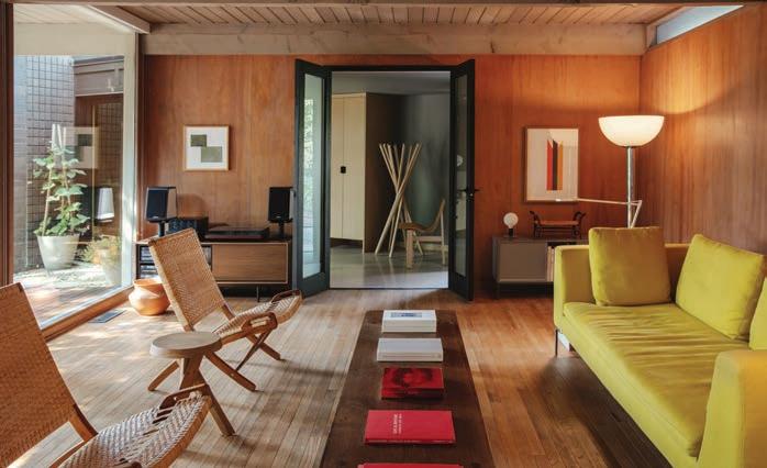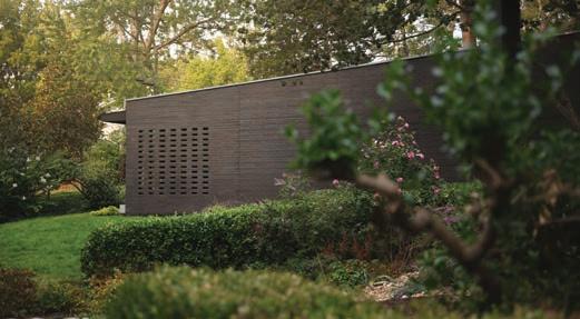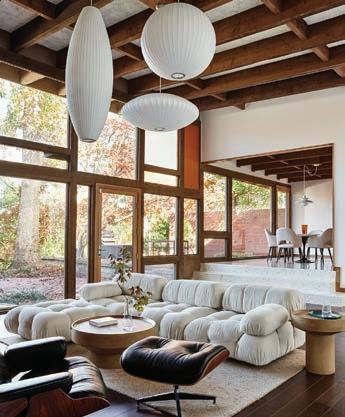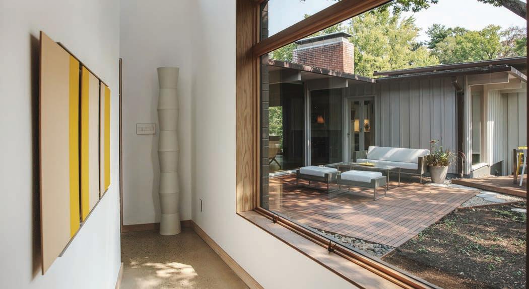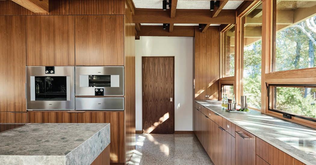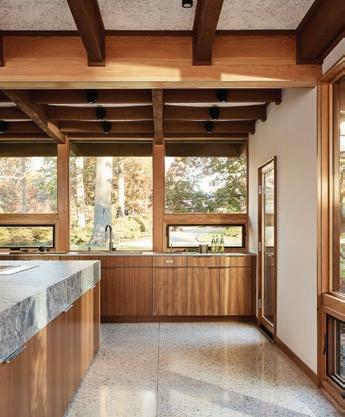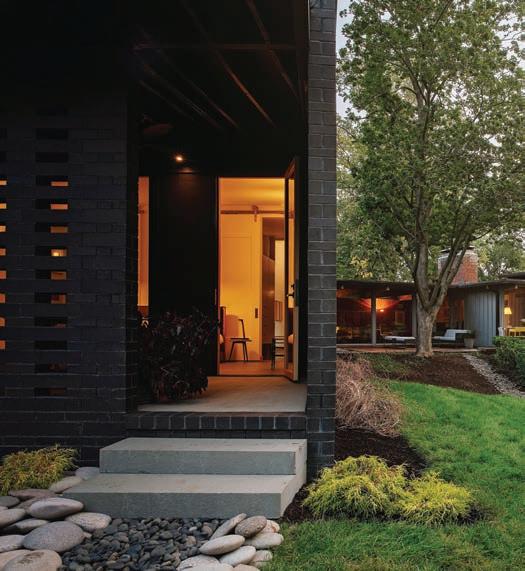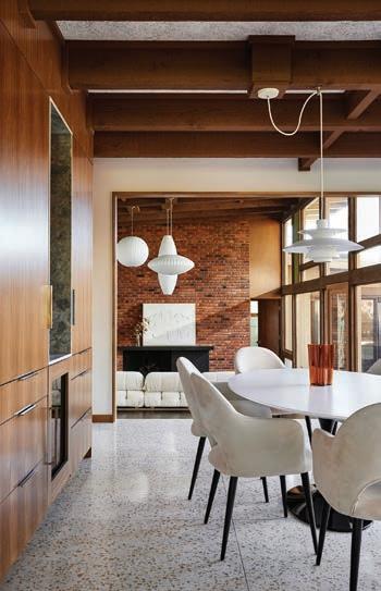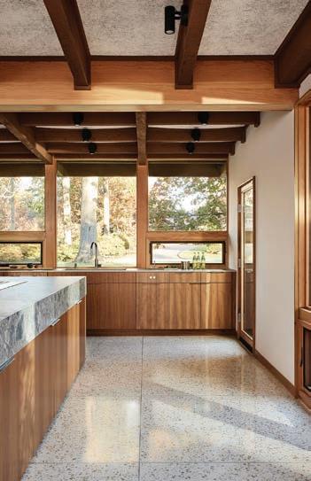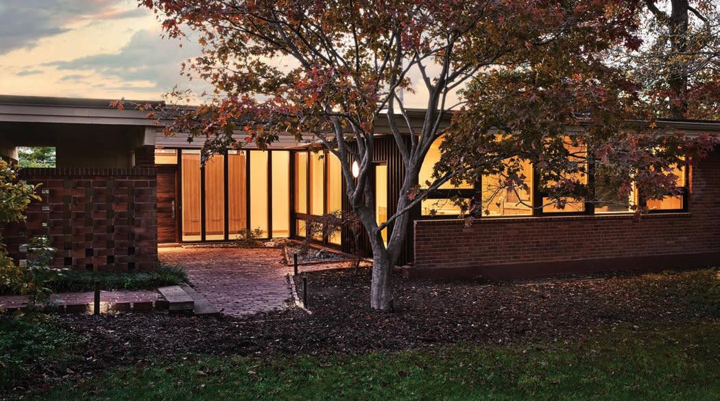 This mid-century modern residence — originally completed in 1960 by esteemed St. Louis architect Isadore Shank — underwent an extensive renovation to update the existing, tired interior. The design concept endeavored to preserve Shank’s signature architectural vocabulary while appropriately upgrading the residence for contemporary living. The completed residence expresses contextually appropriate, optimized interiors while simultaneously preserving the architectural character of the original residence. Renovations were concentrated on the ground floor kitchen/living/dining areas and aimed to bring openness and connectivity to these previously compartmentalized spaces. Interior walls were surgically removed with beams that seamlessly integrate into the original latticed structure, providing spaces that are generous and airy. Several exterior walls were entirely rebuilt with Douglas fir glazing systems to bring added natural light to the interior and restore the entry facade in rich, stained wood. Neutral terrazzo floors were installed throughout the kitchen and dining areas, further enhancing the feel of flow and connectivity and offering a nod to materials appropriate to the residence’s era. Rich walnut cabinetry, bright white walls and classic modern lighting complete the aesthetic, contributing to the inviting and cozy atmosphere of the home. Designs for the renovation preserved the most celebrated Isadore Shank details, including the living room’s colorful window wall — evocative of Mondrian-inspired graphic compositions — as well as the durable and textural Tectum ceiling panels. The masonry fireplace that grounds the living area was reclad in black granite, providing a fresh aesthetic that quietly pays deference to the expansive red brick wall. The completed effect is a sensitively renovated residence where lines between old and new are blurred. Photography by Ashley Gieseking