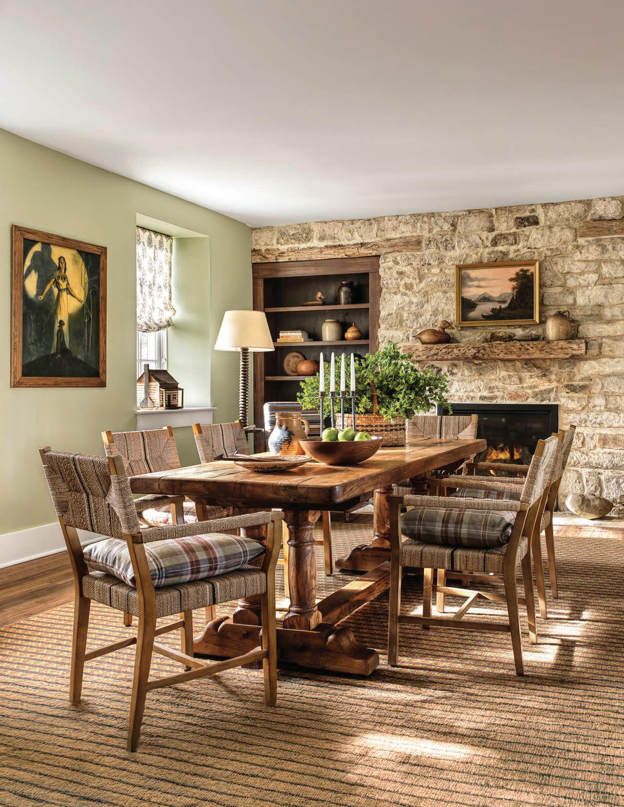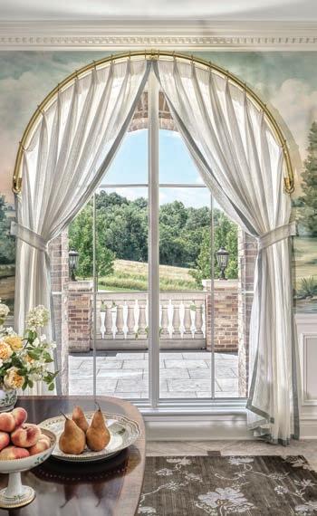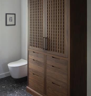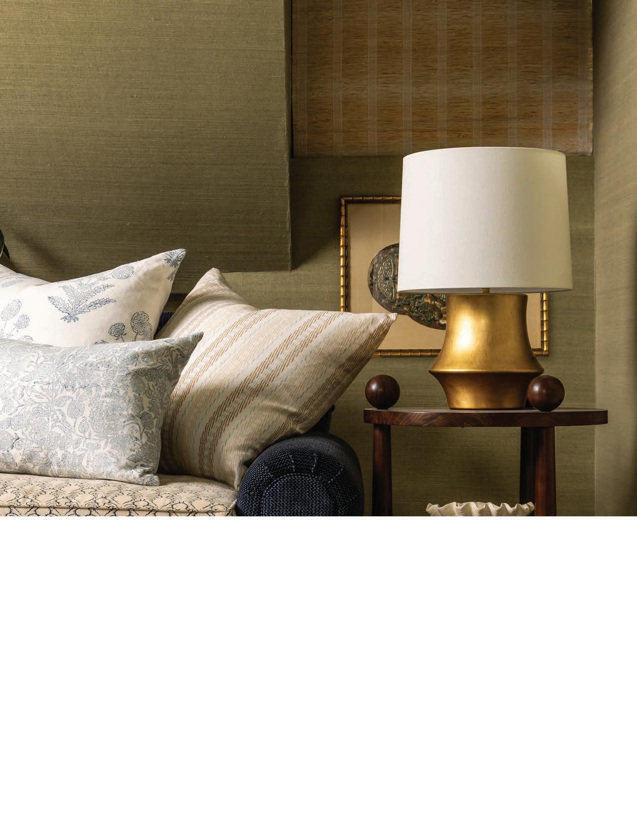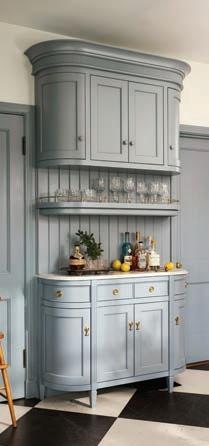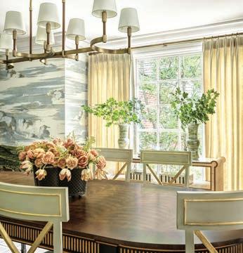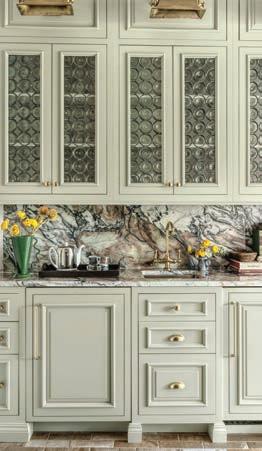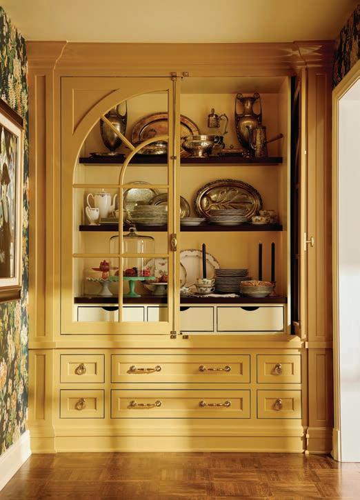 This custom hutch is painted in a high-gloss golden yellow lacquer that brings a vibrant, joyful energy to the space. Its formality is balanced by playfulness in color and softened by a paler yellow interior that adds dimensionality and depth. Arched dividedlight doors — with curved mullions reminiscent of Georgian transom windows — set the tone for the piece’s architectural influence. Brass Cremone bolts and ring pulls were hand -selected and positioned with precision, adding jewelry-like detail that feels simultaneously historic and fresh. Inside, walnut-stained shelves provide rich contrast and support a thoughtfully curated blend of heirloom silver, crystal, china and everyday tableware. The hutch’s counter height ensures functionality as a buffet or bar, while deep drawers below add ample storage without overwhelming the space. Every line and proportion of the hutch was calibrated to feel permanent, as though it was always meant to live here.
