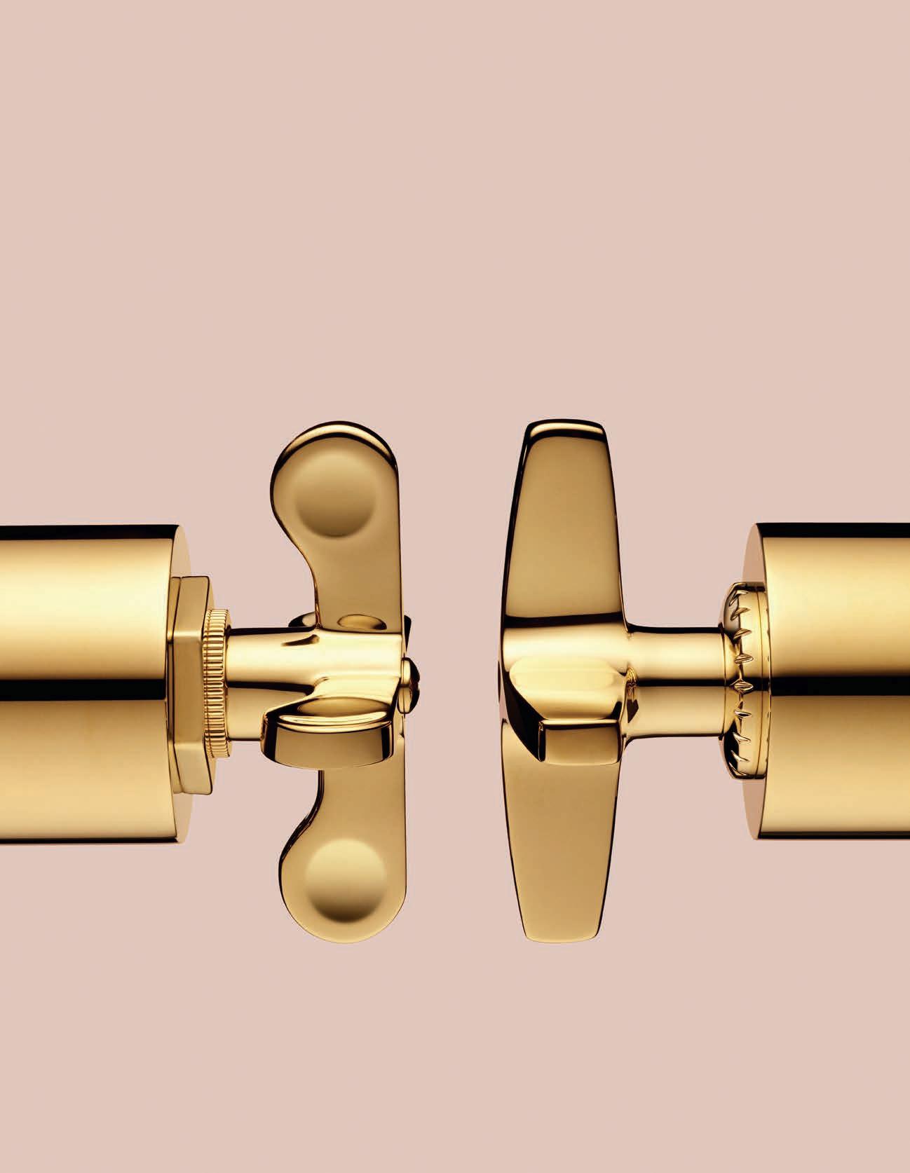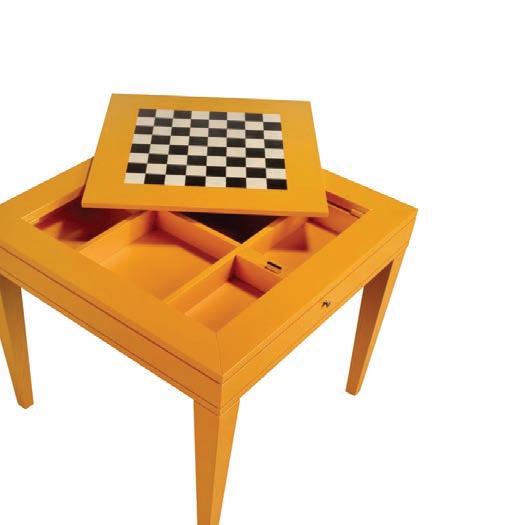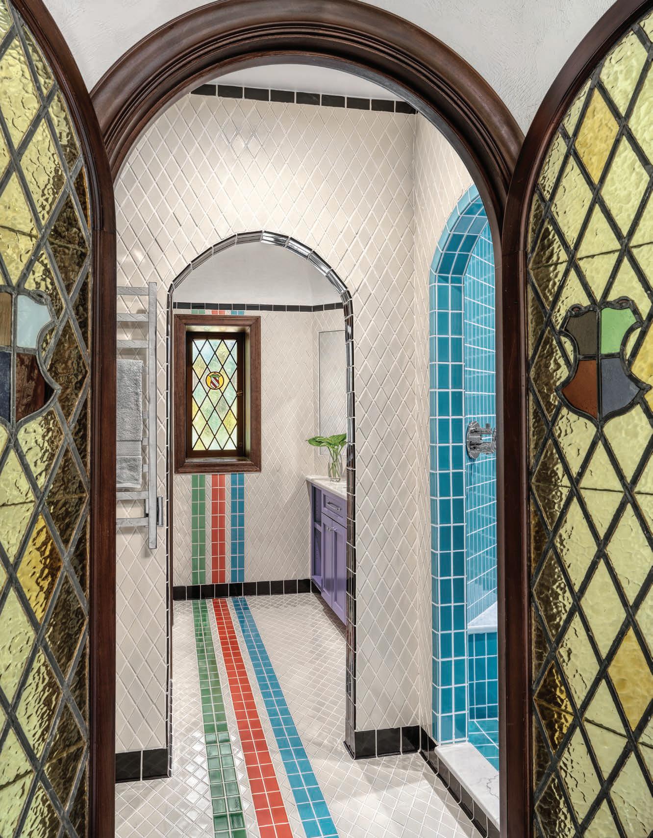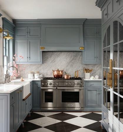 This custom hutch is painted in a high-gloss golden yellow lacquer that brings a vibrant, joyful energy to the space. Its formality is balanced by playfulness in color and softened by a paler yellow interior that adds dimensionality and depth. Arched dividedlight doors — with curved mullions reminiscent of Georgian transom windows — set the tone for the piece’s architectural influence. Brass Cremone bolts and ring pulls were hand -selected and positioned with precision, adding jewelry-like detail that feels simultaneously historic and fresh. Inside, walnut-stained shelves provide rich contrast and support a thoughtfully curated blend of heirloom silver, crystal, china and everyday tableware. The hutch’s counter height ensures functionality as a buffet or bar, while deep drawers below add ample storage without overwhelming the space. Every line and proportion of the hutch was calibrated to feel permanent, as though it was always meant to live here.