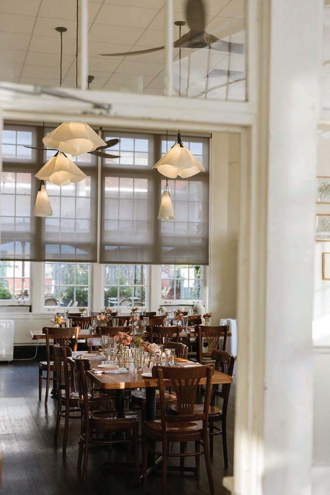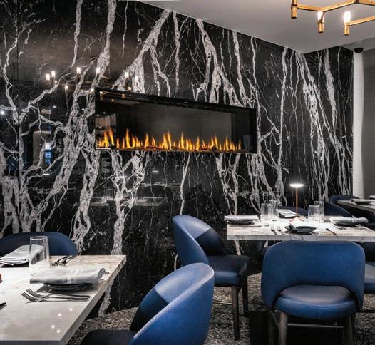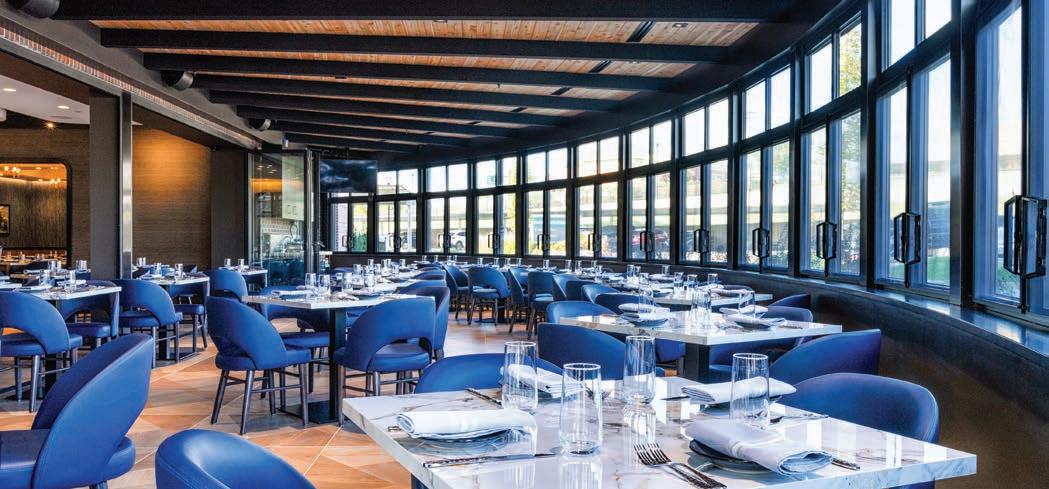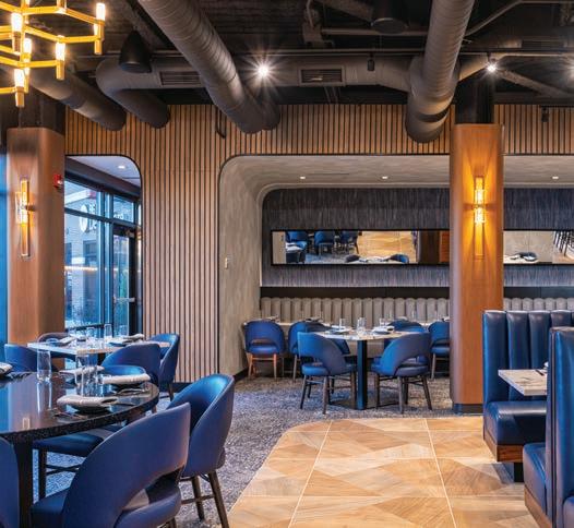 Our assignment was taking a restaurant into a gray-box space in an existing mid-rise building with a challenging column grid and ensuring it would run like a Swiss watch; with seamlessly arranged seating for over 200 diners and incorporating an expansive kitchen and the complicated mechanical system that went along with it. The resulting restaurant is a beautiful, comfortable place for guests and staff. The finished floorplan delivered a space to please any diner: a cozy dining room just off the reception area; a vibrant bar; a semicircular “patio” room that can be closed off from the bar via a NanaWall system; a large secondary dining room; and a wine room for small private parties. Our client wanted an approachable yet elevated dining experience to suit both regulars and guests celebrating special occasions. The design naturally flowed from the triangular-shaped floorplate. We landed on a palette of walnut, blue and stone with organic-patterned carpet and Italian large-format floor tiles in a stylized wood pattern for the bar and circulation paths. All of the dining areas were planned with acoustical treatments, both seen and unseen: the wood slat panels are acoustic, as are the black-clad beams in the patio. There is also a hefty layer of mineral wool on top of the ceiling clouds in the bar. The wine room features a wall of Nero Marquina marble and the client opted to leave the fissures unfilled for character. Flanking the doors of the wine room are custom-made glass wine storage walls: the left side has been conditioned for white wine and the right side for red wine. The kitchen features a 36-foot-long hood and perhaps the nicest space we’ve designed for kitchen staff. The client insisted on stainless steel wall cladding. The flooring is a self-coving heat-welded product that offers staff a slightly cushioned feel and no pesky grout lines for easy cleanup at the end of the night. Overhead lighting is 90 CRI, so the food will look amazing when it is served in the dining room. Much of the mechanical equipment is on the roof or in a remote equipment crib behind the restaurant.
