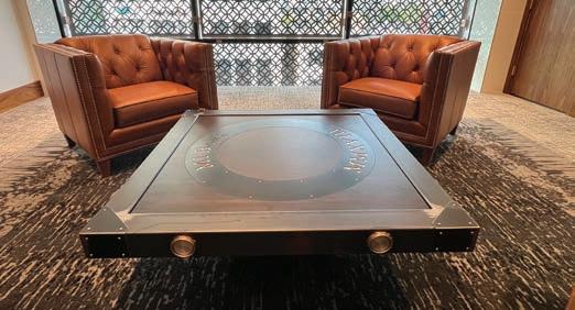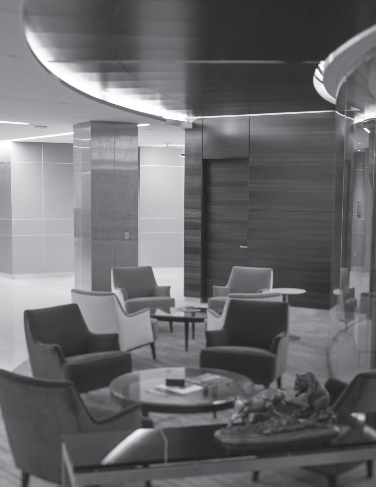 To enhance our architectural and interior design work, we created custom furniture pieces for M1 Bank that reflected the project’s themes. Bank vault items and visuals were used, such as locks, gears and levers. The boardroom table recalls the visual of solar panels, which is in reference to one of the bank’s biggest investment clients. The palette of materials, colors and textures has been refined over three projects for M1, allowing us to further develop the design language we established for their brand.