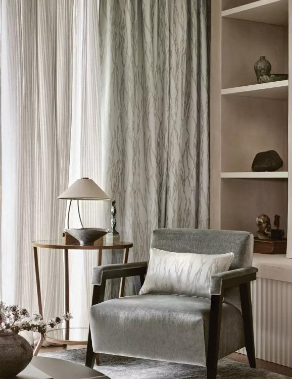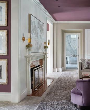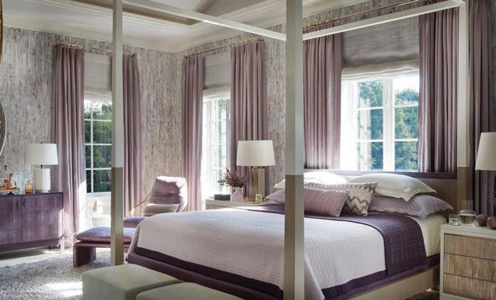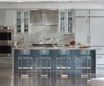 Built in 1994, this residence was in need of a renovation that reflected the homeowner’s personality and style. The original interior was heavy with dark colors and out-of-proportion rooms. This renovation softened the entire space with shades of off-white, lavender, pale blue and silver. Dark rooms were opened up with French doors and pale wood floors. The entry’s double-height space needed a gentler touch, so the design included undulating carpets in plush grays and a honed limestone floor. The center table was commissioned by a sculpture artist to anchor the room. It is designed with a soft matte finish and an abstract spiral base that complements the curve of the sweeping stair. The entry is finished with contemporary wing chairs, Alex Katz portraits and an expressionistic chandelier. The kitchen was brightened with polished nickel bands framing the custom cabinetry and high-gloss gray cerused oak floors. The bar in the butler’s pantry beautifully reflects the light with translucent quartzite countertops and a rippled, mirrored backsplash. Silvers and blues continue in the family room that showcases all custom furniture with the exception of the chairs. The walls are finished with handcrafted panels which conceal an inset TV and dimpled paper that create a feeling of comfortable glamour. The primary suite incorporates violets, aubergine, milky whites and silver to create continuity with the rest of the home. The custom bed is surrounded by layers of calming deep color tones with soft stone textures, accents of shagreen, polished nickel and brass. A custom open fireplace and coordinating inset TV frame are set into a central column of stone cladding. Invisible speakers and automated shades complete the calming features of the space. Other renovated spaces include a bar off the dining room, a lower level with guest suite and exercise room, three family bedroom suites, a boot room and powder room. Photography by Luke White