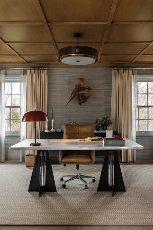 This home office was designed as a warm, moody retreat tailored specifically for the client — a space that balances functionality with refined, masculine style. Rich materials like a wood-clad ceiling, custom built-ins, and grass cloth walls set a cozy yet elevated tone. Thoughtfully selected furnishings offer both comfort and sophistication, while personal touches, including the client’s own taxidermy, bring character and individuality to the space. The challenge was to create a room that felt personal and grounded while maintaining a cohesive flow with the rest of the home. Completed in 2025, the result is a tailored and timeless environment made for focus, relaxation and style. Photography by