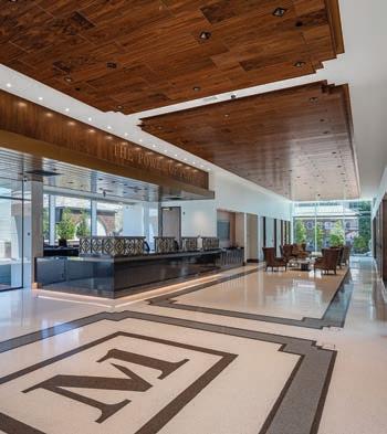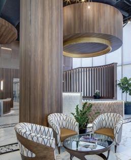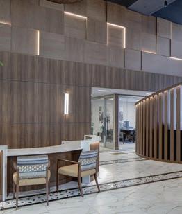 The interior renovations of this newly completed bank branch redefine the traditional banking experience with a design that is equal parts refined and welcoming. The client sought to carry forward the elevated aesthetic of its recently renovated headquarters into a new environment, one that could confidently reflect the sophistication of its surroundings while supporting both everyday transactions and high-touch client engagement. The result is a space that blends hospitality and function, wrapped in a palette of rich textures and timeless materiality. At the core of the design is a soaring two-story atrium that greets clients with natural light and visual clarity. Anchoring the space is a gracefully curved teller pod, strategically positioned to align with dual entry points for ease of access and visibility. Above, custom circular soffits with integrated lighting create a sense of hierarchy and intention. A sculptural wood slat wall wraps the teller zone, concealing a discreet entertainment area behind —perfectly suited for private events and client hosting. The public-facing banking zone at the front transitions smoothly into more intimate areas. Glass-front offices provide a balance of transparency and discretion, supporting focused conversations without sacrificing daylight. Toward the back of the suite, a large, fully equipped conference room and a residentially inspired breakout area offer space for longer meetings or informal gatherings. An employee breakroom tucked in the rear corner serves as a quiet retreat, with direct access to the parking garage.