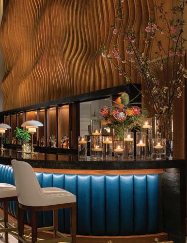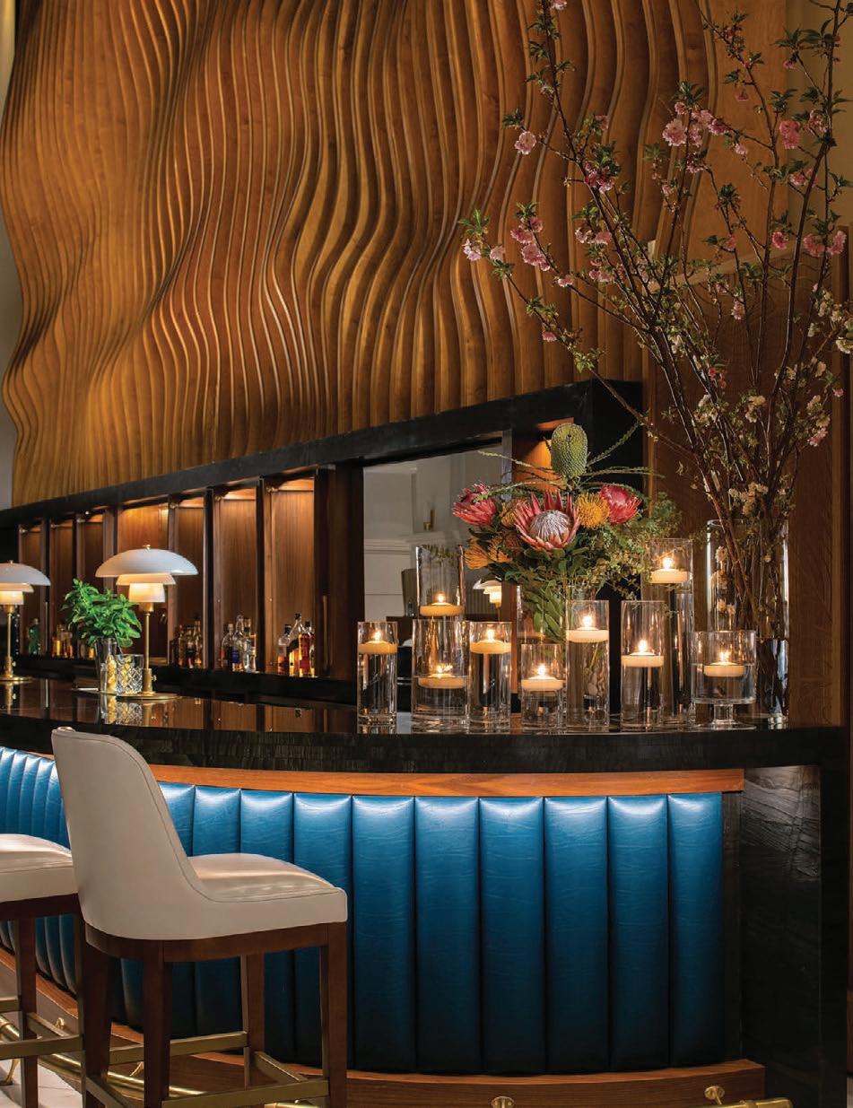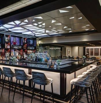 This interior renovation transformed an aging country club into a contemporary destination by thoughtfully blending modern aesthetics with budget conscious materials and solutions. The project aimed to refresh the club’s overall ambiance, enhance lighting and acoustics and optimize spatial layouts to support casual, bar and fine dining experiences to attract younger members. Key focus areas included the main lobby, Grille, ballroom, private event spaces and the women’s locker rooms. The reimagined bar and lounge now open to show off breathtaking views of the 18th hole. Fit with updated finishes and custom laser cut metal lighting, the space now offers enhanced flexibility and visual impact. Adjacent library spaces were also revitalized to better accommodate private functions and intimate gatherings. In the Grille, spatial planning played a pivotal role. To clearly define zones for casual dining, bar activities and formal dining, the bar was relocated from the entryway to the center of the room, significantly expanding its footprint and establishing it as the social heart of the space. Acoustic upgrades including sound resistant folding glass partitions, acoustically backed wood slat ceiling treatments and upholstered wall panels ensure an elevated auditory experience without compromising the aesthetic. Custom lighting was used as a key design element over the bar to create a”wow” factor using laser cut metal to shape mood and define space. In the main lobby, a suspended installation of metallic and glass rods accented by precise spotlighting creates a striking, cost effective, yet sculptural, focal point. Layered lighting schemes were implemented across all areas to support both atmosphere and function.