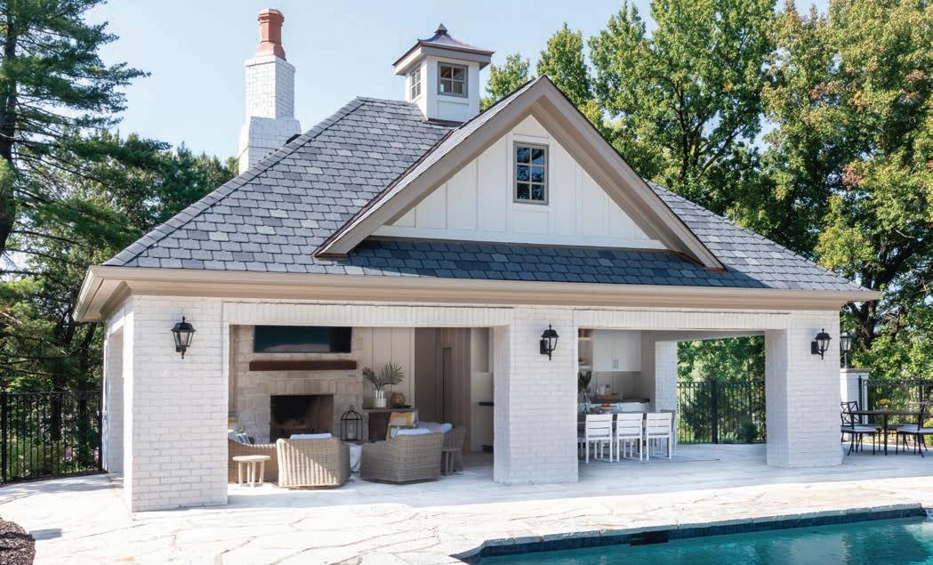 A stunning 845-square-foot pool house was designed to create a complementary structure of the main residence to expand living space and functionality. The pool house addition provides an area for the whole family to enjoy while relaxing at the pool or simply spending time outside watching the game or hosting a gathering. The retractable screens on three sides allow for the luxury of creating your own atmosphere. Adjusting from wide open when enjoying the daytime pool activities and down in the evening while watching the game and keeping the bugs out. One of the most notable design elements of this pool house is the beautiful wood ceiling that runs the length of the structure, providing warmth against the white board and batten, natural stone fireplace and flagstone flooring. Considering the smaller living space, we visually expanded it by using the same elements throughout, allowing one to view the structure as a single environment versus smaller, compartmentalized spaces. Interior design of the pool house included all cabinetry designs, material selections including paint and stain, cabinetry, countertops, flooring, lighting, plumbing, art and accessories, furnishings and area rugs and all hardware. Photography by Ashley Gieseking