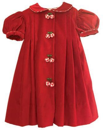 Scarlet Red Velveteen Classic Cherry Dress with Silk Gingham Cherries and Piping: $250