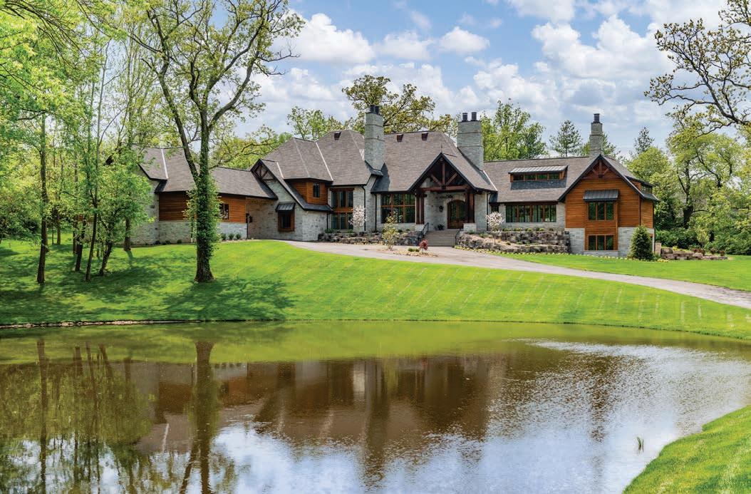 Situated on a 3-acre lot in Huntleigh, Missouri, this mountain home takes full advantage of its natural setting. Our design team carefully studied the property’s existing features — including a serene pond and gently sloping hill — to determine the optimal orientation. This thoughtful positioning not only ensures privacy from neighboring properties but also creates carefully framed views of the surrounding landscape. One of our primary challenges was maintaining the authentic character of mountain homes while incorporating abundant natural light. The solution? Strategic window placement and architectural details that respect the rustic home’s interior aesthetic while transforming its interior spaces. By incorporating elevated ceilings throughout, we were able to install dormer windows high on the walls, allowing natural light to cascade down into the living spaces below. The home’s design radiates from a central core comprising the kitchen, dining area and family room — spaces that foster connection and daily living. Guests are welcomed by a dramatic entry foyer featuring a large masonry see-through fireplace and an elegant groin vaulted ceiling, setting the tone for the sophisticated yet warm atmosphere that pervades this mountain rustic house. Throughout the 7,000 square feet of living space, our team incorporated numerous distinctive features that elevate the home beyond the ordinary. Five bedrooms and six full bathrooms, plus three half baths, ensure ample space for family and guests. The music room, complete with its own fireplace, provides an intimate setting for entertainment while a dedicated wine room adds a touch of sophistication to the home’s interior. This mountain rustic home stands as proof that natural beauty and modern comfort can coexist in perfect harmony.