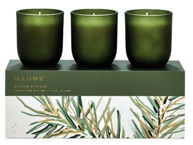 Three frosted glass candles sit inside a beautiful box with hand painted art and pops of gold foil. Grounded in rich oak moss with a heart of fir needle kissed with warm cinnamon.