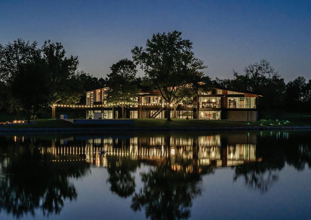 Our client came to us after acquiring a rural property that bordered a private lake. The idea quickly formed to build a long, shallow house across the width of a peninsula so that all of the interior spaces would have views of the lake. Knowing the client wished to blur the line between the interior and exterior, floor to ceiling glass was planned for each of the lake-facing walls. From the exterior, you can visibly identify the three main functions of the house as they are represented by the primary masses of the structural form, each capped with a mono-pitched, low-sloped roof structure. At the center of the main floor, a family room/kitchen greets you as you enter the front door. This space is flanked by the primary bedroom suite and home office. On the lower level, an entertainment space is centered between the workout studio and guest bedrooms. The lower-level entertainment space has a walk-out exit to the end of the peninsula where you can find the lake-side swimming pool and sunken firepit. As you stand at the end of the peninsula, surrounded by water on three sides and listening to the water splashing on the granite bank, you can’t help but look back to the glass house on the lake and feel an overwhelming sense of tranquility. Photography by Megan Lorenz