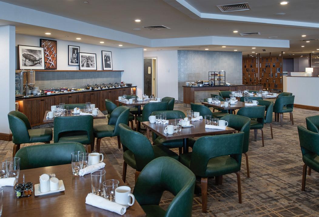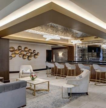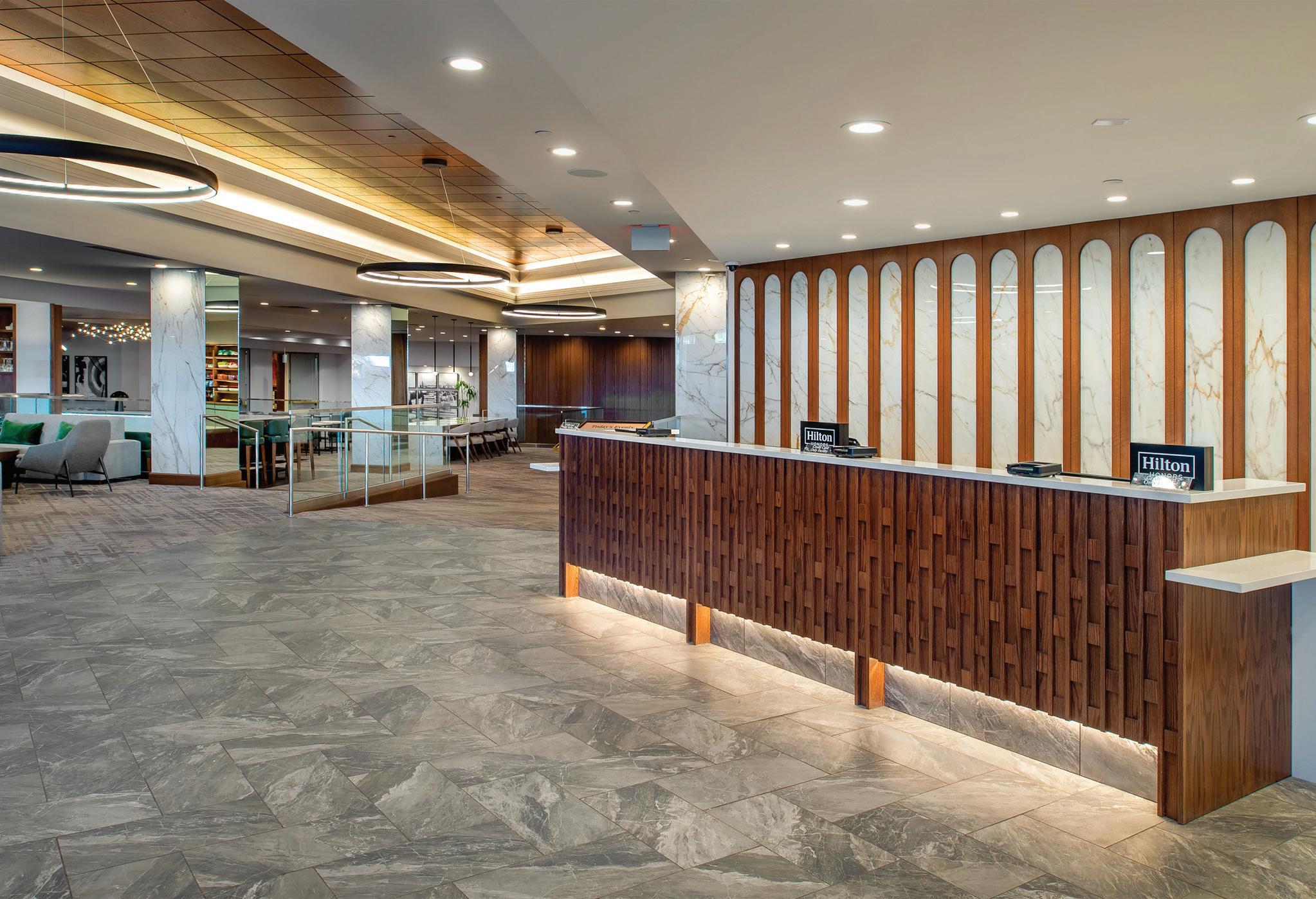 Our team recently completed design work for renovations to public areas at the St. Louis Airport Hilton Inn, delivered as part of a strategic new dual-branding concept for operator Lodging Hospitality Management and coordinated to seamlessly integrate with a newly constructed Hampton Inn expansion on the property. As the Architect of Record as part of the property’s overall repositioning, our team provided design guidance and facilitated construction documents, planning/zoning, permitting and construction administration. Key goals of the renovation included improving sight lines and natural lighting throughout the common spaces, as well as accentuating the guest arrival experience in the hotel. Low-height partitions were removed towards the entrance to increase daylight and visibility into the lobby, while a former elevated planter was replaced with functional upholstered banquette seating. Faced with the unique challenge of ensuring the newly renovated public areas would be suitable for two distinct hotel concepts, the design team identified consistent design materials in format porcelain panels with variegated veining and medium-stained walnut, which thread together the reception/lobby, restaurant/buffet, market and bar areas. Stained wood screen walls also provided visual appeal and functional separation between the public areas. Further site improvements included improved pedestrian circulation, reinvigorated landscape architecture and ADA accessibility provisions.