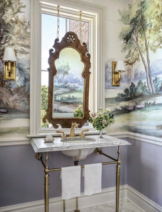 This little jewel of a powder room is full of natural light with two corner windows, allowing the countryside views of the meadows to infiltrate the small room. An antique English mahogany and gilt mirror was suspended by brass decorative chain above the open marble-topped brass-legged console sink to add old world country charm to a new world convenience room. A hand painted landscape mural by artist Susan Harter wraps the room and is reflected back into the mirror. Lilac paint below the chair rail often reflects the color of the sky views and colors beyond, completing the enchanting space. Photography by Alise O’Brien