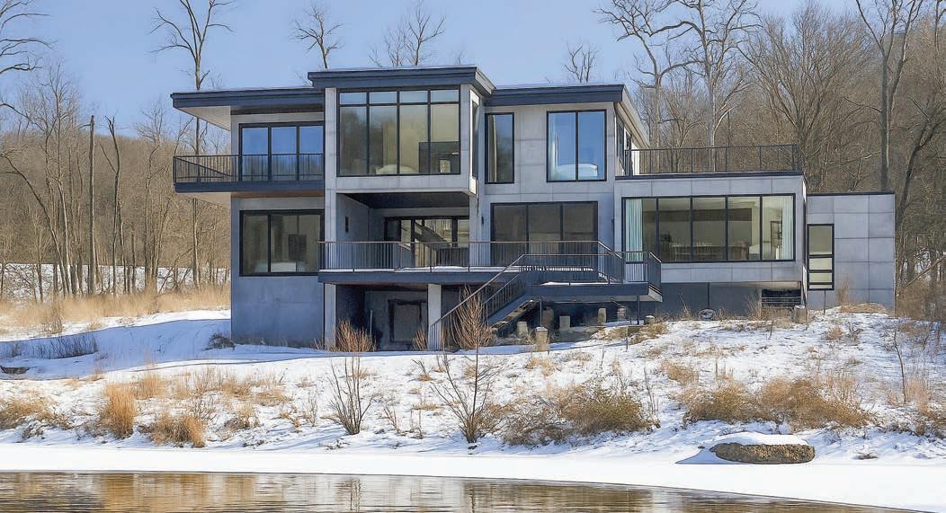 This residence is a thoughtful fusion of contemporary design and rural vernacular, situated in a landscape defined by water, stone and field. Though it is entirely new construction, the home is designed to appear as if it has evolved over time, adapting an original 19th-century stone barn — echoing the agrarian heritage of the surrounding region. This home is not just a shelter — it’s a meditation on memory, material and the enduring beauty of the landscape. Rural forms are expressed through heavy masses of locally sourced fieldstone, grounding the home in its historical context. These elements are juxtaposed against crisp contemporary volumes clad in smooth zinc panels, creating a compelling dialogue between past and present. The composition is both familiar and new — respecting the memory of place while embracing a modern lifestyle. The nearby lake serves as a major design influence, inspiring a series of integrated water features that stitch the architecture back to the shoreline. Landscaping plays a critical role in the home’s identity. Natural grasses are organized into regimented beds — offering a controlled, contemporary counterpoint to the wildness of the site and reinforcing the architectural tension between structure and nature. A hidden garden, accessed from the primary suite, provides a moment of quiet discovery. Bounded by a stacked-stone wall designed to appear aged and partially collapsed, it evokes the feeling of a long-lost ruin reclaimed by its owners as a private sanctuary.