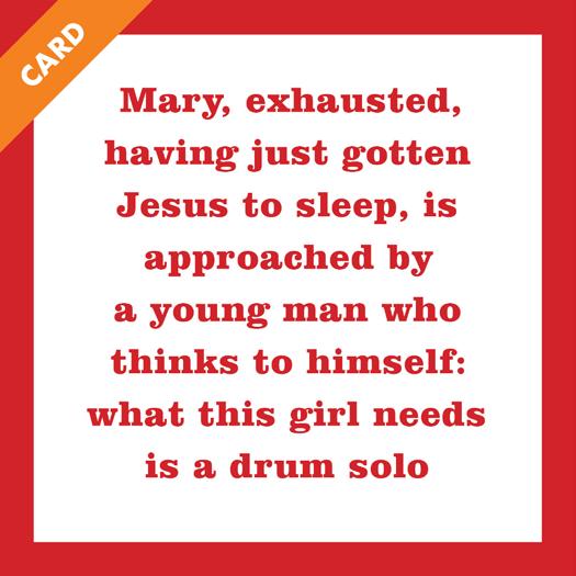 Mary, exhausted, having just gotten Jesus to sleep, is approached by a young man who thinks to himself: what this girl needs is a drum solo