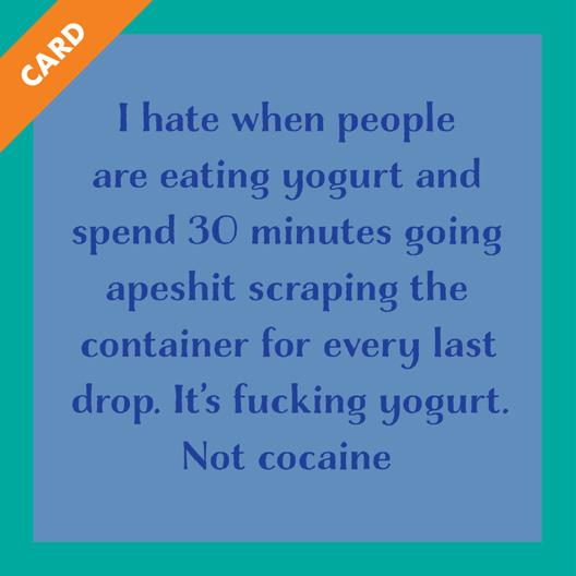 I hate when people are eating yogurt and spend 30 minutes going apeshit scraping the container for every last drop. It’s fucking yogurt. Not cocaine