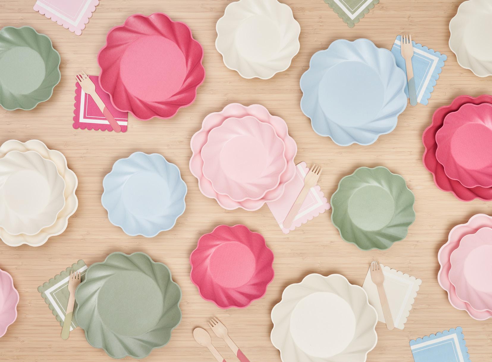 Sustainable meets Sophisticated in our beautiful new line of wavy, eco-friendly and compostable plates made with bamboo fiber, and matching wooden cutlery.