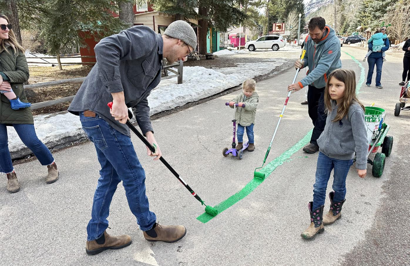 Carrying on Redstone a tradition that dates back at least 15 years, a paint crew marked a symbolic St. Patrick’s Day Parade route on Saturday. It was a symbolic route down the Boulevard this year, because there was no parade on Sunday. The congregation, 20 to 30 strong, that followed the paint crew was pretty much the parade. The painters, which at times included little kids, also painted green shamrocks and “SLOW” on the road. Photo by Lynn “Jake” Burton