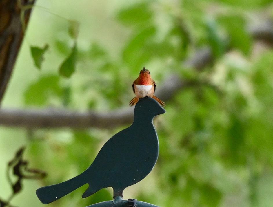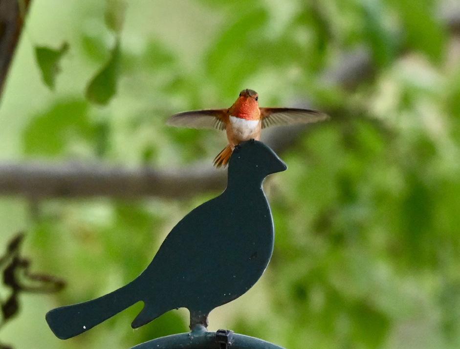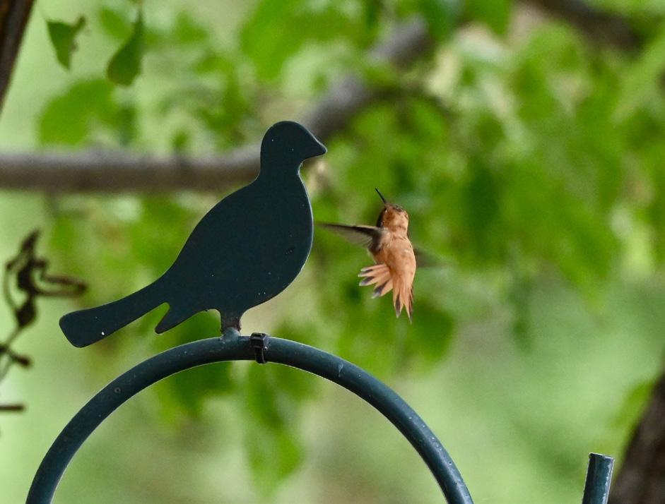 A rufous hummingbird appears to suspiciously inspect a silent blackbird before deciding that it makes a suitable perch.