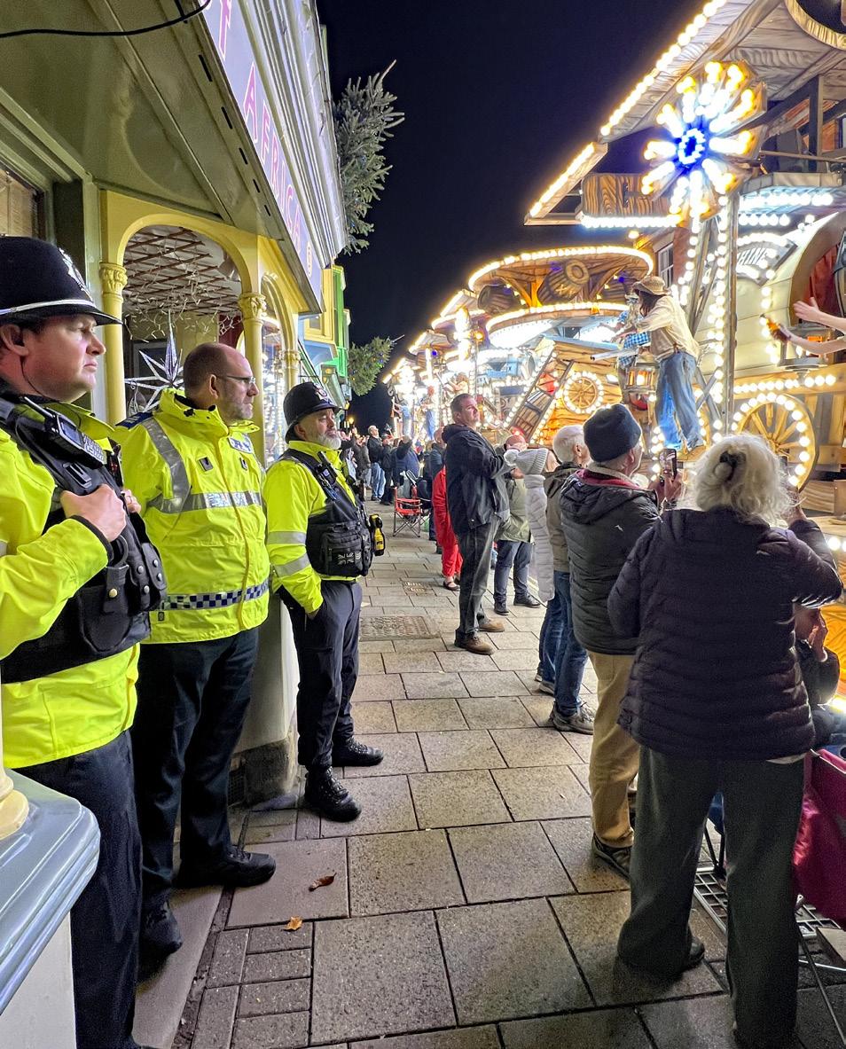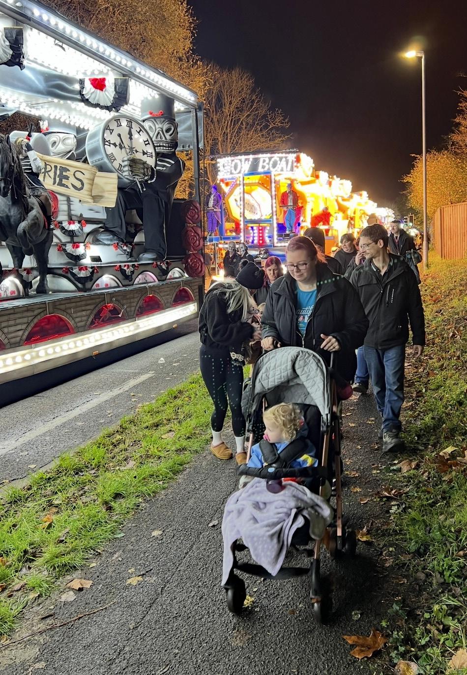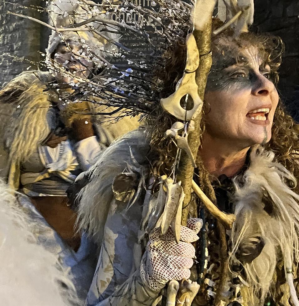 After the Wild Hunt, heralding Hallowe’en and Samhain (SOW-en), the beginning of winter in the old Celtic traditions, comes Carnival. Floats the size of semi-trucks are pulled by John Deere tractors disguised as part of the float. Each display is like a rolling Broadway show with music, dancers, costumes and sets that light up the town — all lovingly crafted by regional clubs that spend most of the year on these works of art. Sixty clubs participated in this year’s parade, touring the countryside during late November. Glastonbury was the last stop.