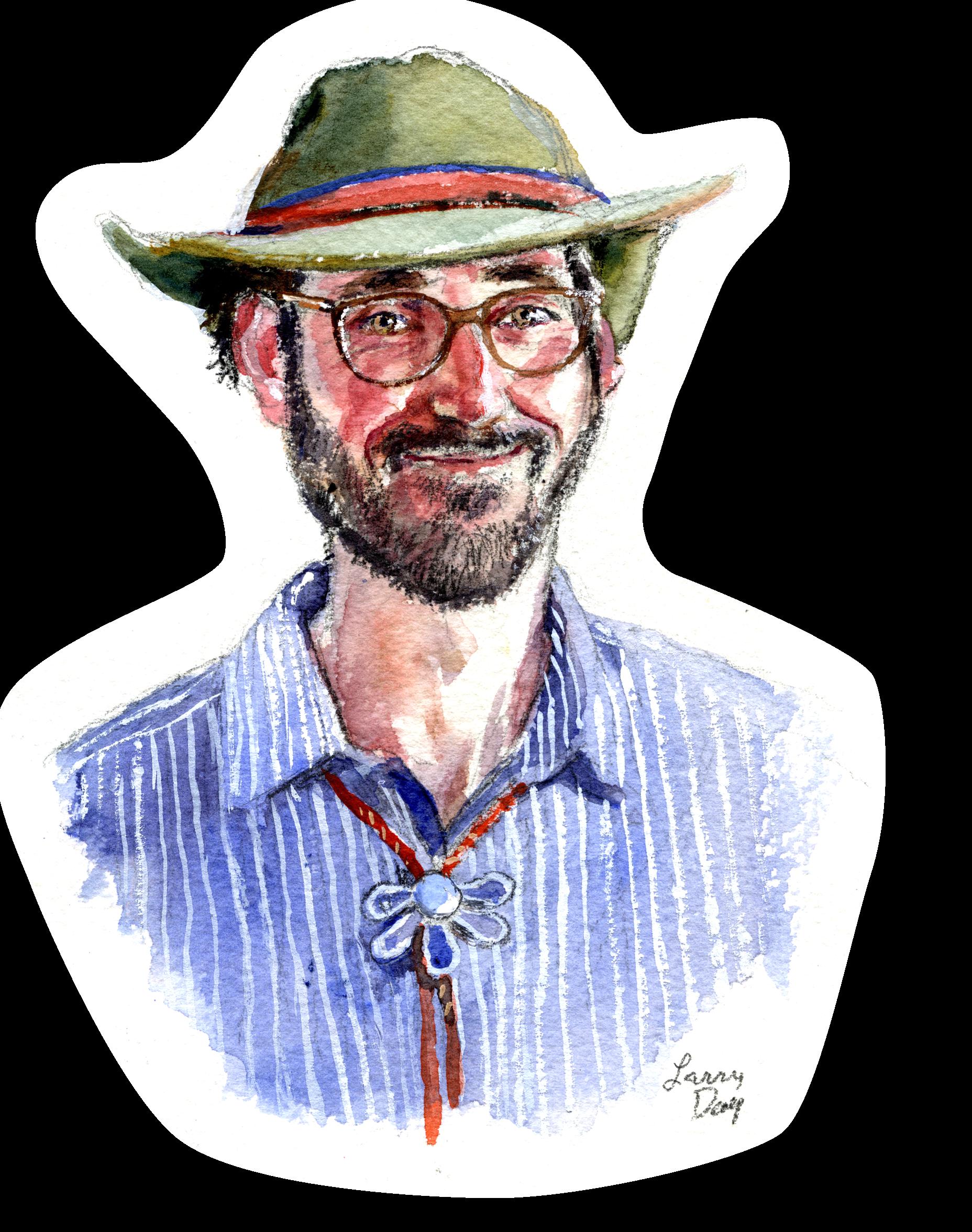 (From the top) a portrait of Raleigh by Larry Day, inspired by a Klaus Kocher photo; the first papers under Raleigh’s editorship of Sol del Valle and The Sopris Sun; a Larry Day sketch of Raleigh at Roaring Fork Drawing Club; and Raleigh working a Cantina shift at Mountain Fair. He’s always willing to lend a helping hand.
