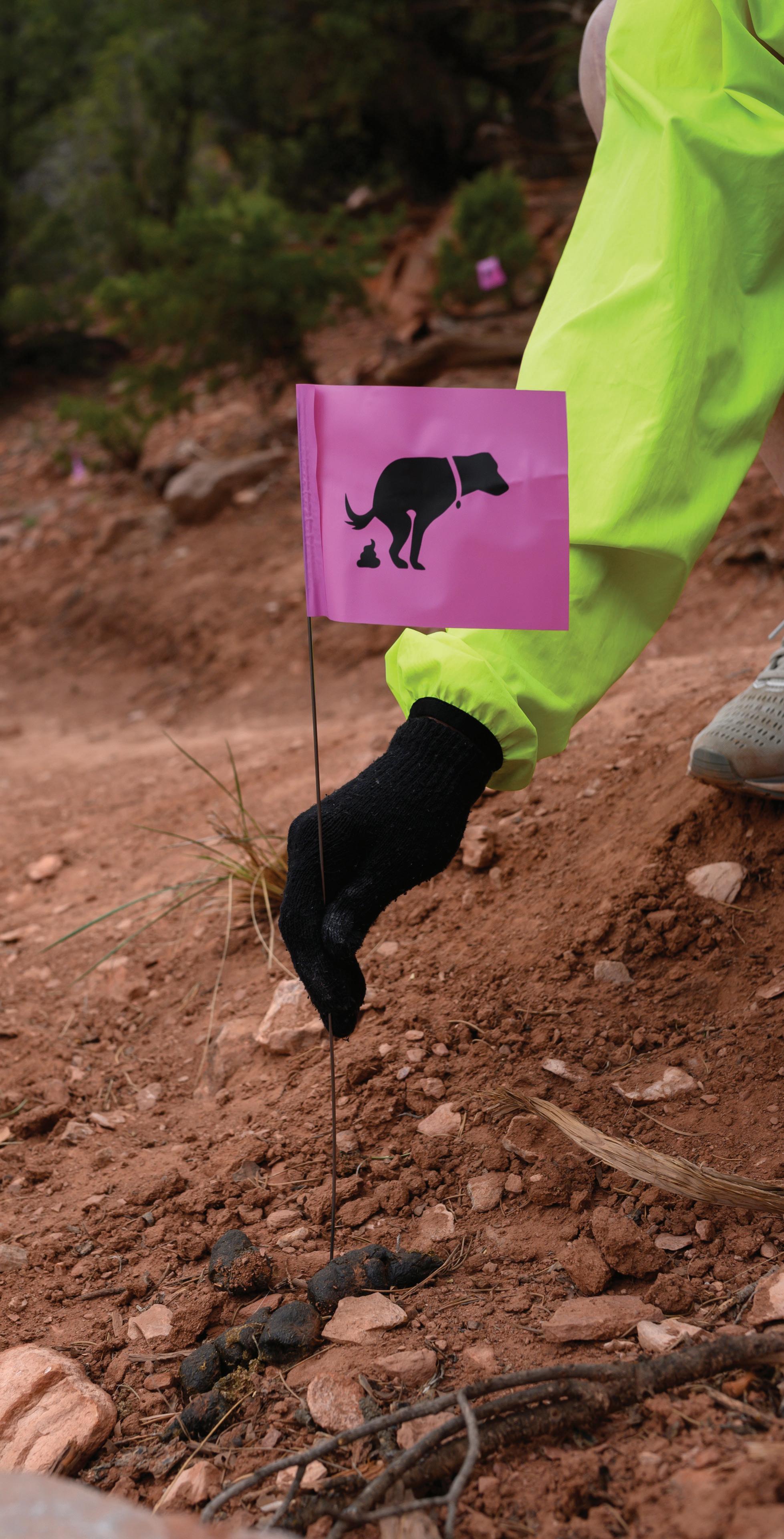 Hikers, bikers and dog walkers who may otherwise ignore the proliferation of poo will not be able to so easily tune out the presence of over 600 purple flags marking each and every turd volunteers have identified within a quarter mile of the trailhead.