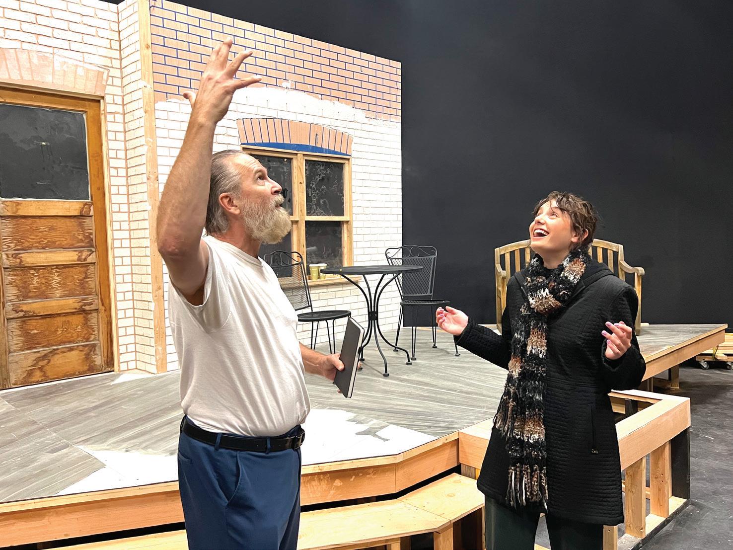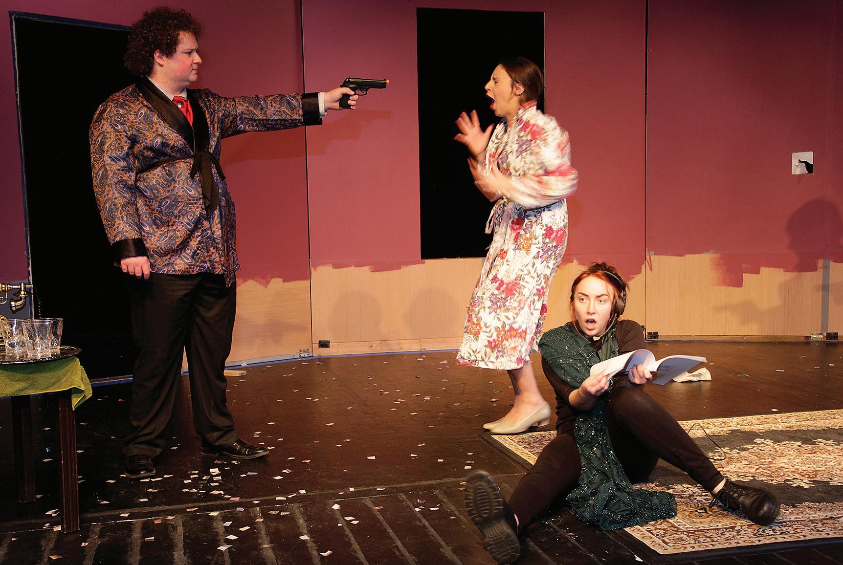 JD Edmonds, Bostyn Elswick, and Julia Whalen rehearse a play within a play.